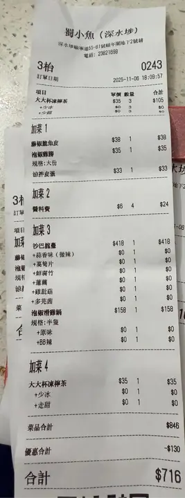 朋友約食飯聚會,提議食烤魚,第一時間就諗到這一間,全盛時間好多分店,尖沙咀都有,現在就只剩下幾間分店了。茶餐廳格局,地方都叫乾淨企理。有個自助醬料吧,可以自己配。選擇這一間烤魚,因為有沙巴龍躉,大大條,肉質結實。泡椒雞腳 $35雞腳都大隻,份量不少藤椒脆魚皮 $38魚皮爽口彈牙,非常好食。涼拌皮蛋 $33 金黃的皮蛋,中間還有流心,配上辣料,很特別。大大杯檸檬茶$35 ,非常大杯,很抵飲。沙巴龍躉, $418價錢不便宜,但龍躉很大一條,肉質結實,新鮮,雖然不便宜,但質素頗高。泡椒滑雞鍋(半隻)$158非常清淡,泡椒味道不濃郁,雞沒有什麼味道,口感很滑。四人埋單$716 ,沒有+1服務費,因為朋友是會員可以有優惠$130 。雖然價錢不是太便宜,但質素不錯,特別是龍躉烤魚,現在很多人都不願意留港消費,假期總是上內地食嘢,希望這些港產小店能夠撐得住,用食物質質素留住香港人留港消費。…查看更多