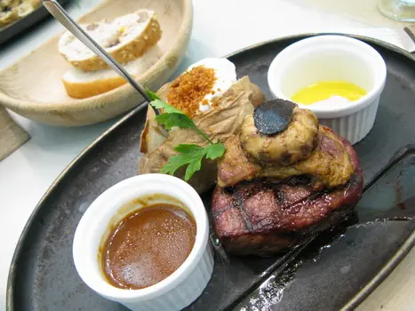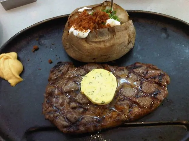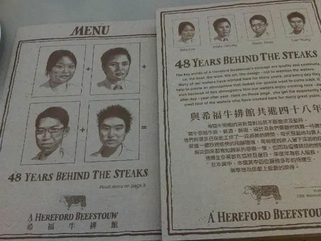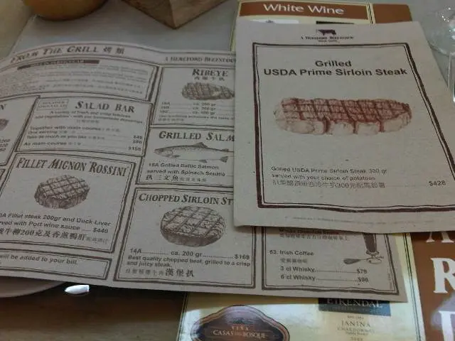 jan 28, 12...........13人嚟dinner.............不過分開2邊落order.........我嗰邊叫咗 :1) hereford set menu x 2 (@hk$228)-這個set真喺超抵食...........聞說喺用番98年個價i) bread-其實只喺平常盒裝牛油+個銀器皿啫-麵包軟熟ii) complimentary house wine x 2-仲有紅酒添,不過我無飲iii) baked escargot in herbs butter x 2-很多油份,田螺無嘜味iv) maina) grilled fillet of black cod wrapped with bacon & thyme-個魚肉幾結實喎,有彈性,不錯-個薯仔配b) grilled australian ribeye steak (200g) with potato wedge-但好似overcook咗少少-味道ok啦v) desserta) blueberry cheesecake-本來set個甜品喺牛油焗杏仁餅,可惜賣晒,唯有揀過-呢個blueberry cheesecake味道普通b) tiramisu-有少少乾,味道普通vi) hot cuppucino x 2-就算喺咖啡,都可以有幾個選擇,可以話算喺咁了2) fillet 300g (hk$398)-叫咗5成熟.............juicy3) sirloin 400g (hk$400)-叫咗5成熟.............juicy4) chocolate brownie with mocca ice cream (hk$78)-比較喜歡個mocca雪糕多d5) ice cream with chocolate sauce (hk$78)-夠凍,有奶香,ok的6) hereford special (hk$98)--呢個喺呢度嘅特色-有vanilla ice cream, raisins marinated in gin, ginger, caloric liqueur, coffee powder-caloric liqueur喺全個雪糕新地嘅靈魂..........據waiter講,樽酒喺入口番嚟7) apple cake with almonds and ice cream (hk$78)-唔掂喺因為底下嘅蘋果片層出水情況嚴重…查看更多