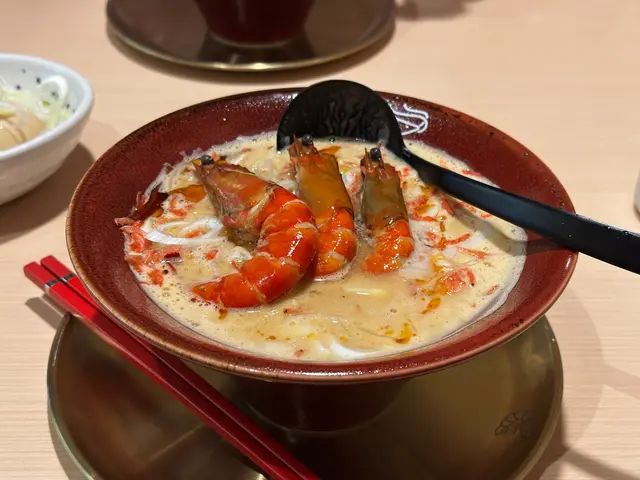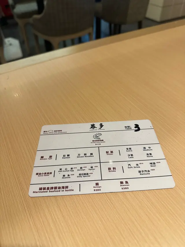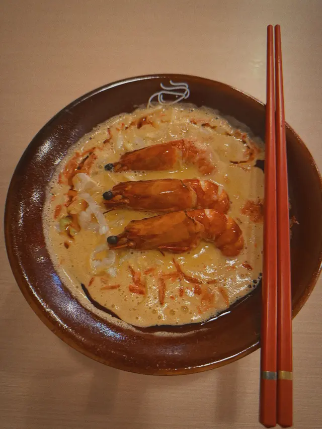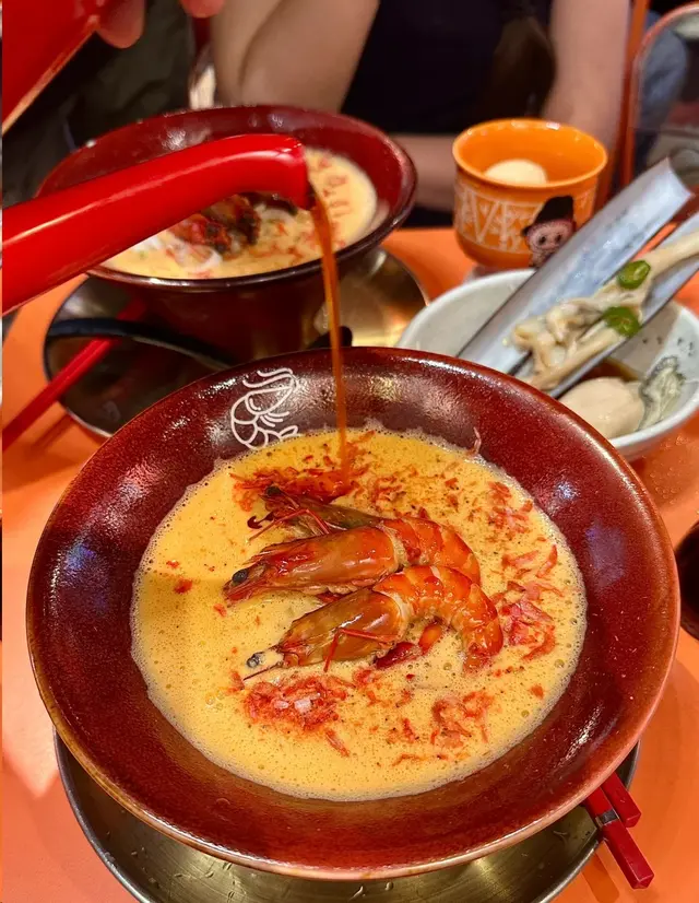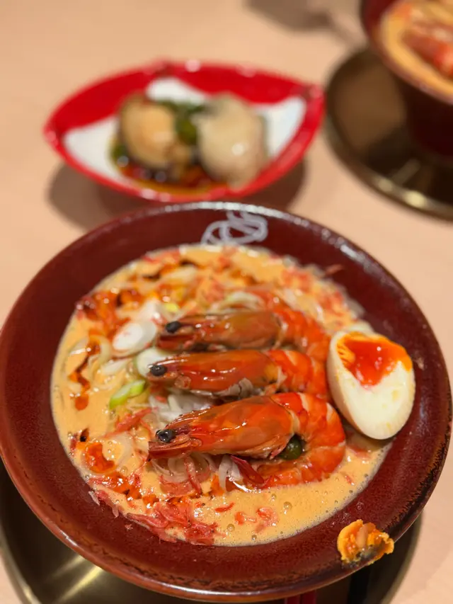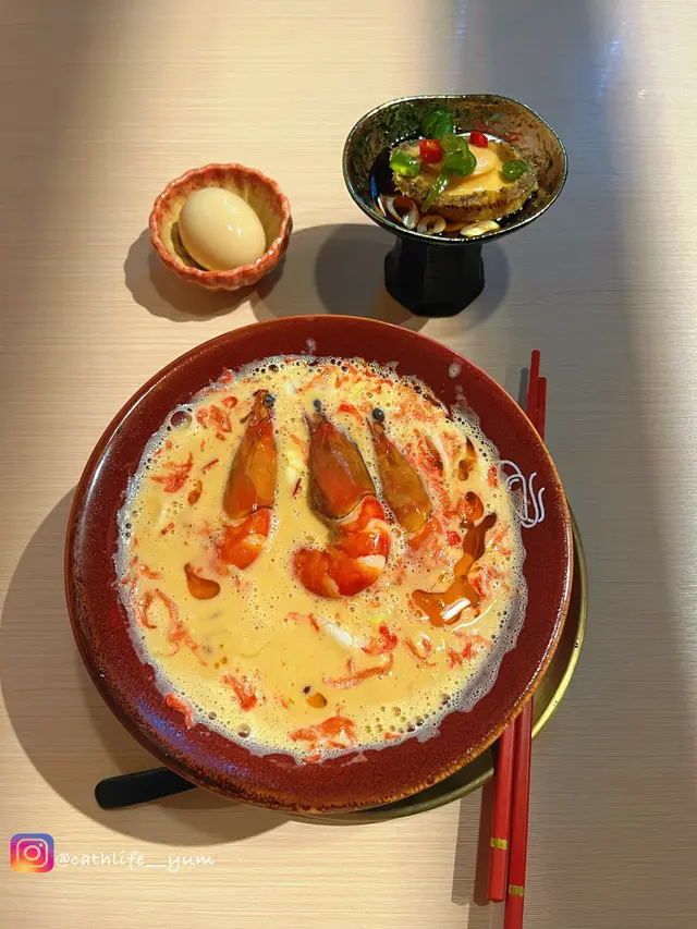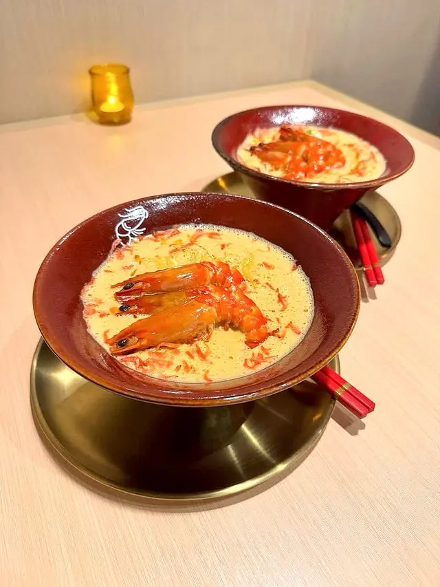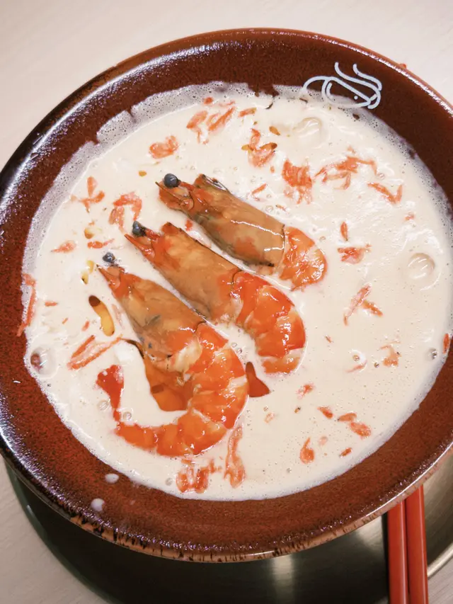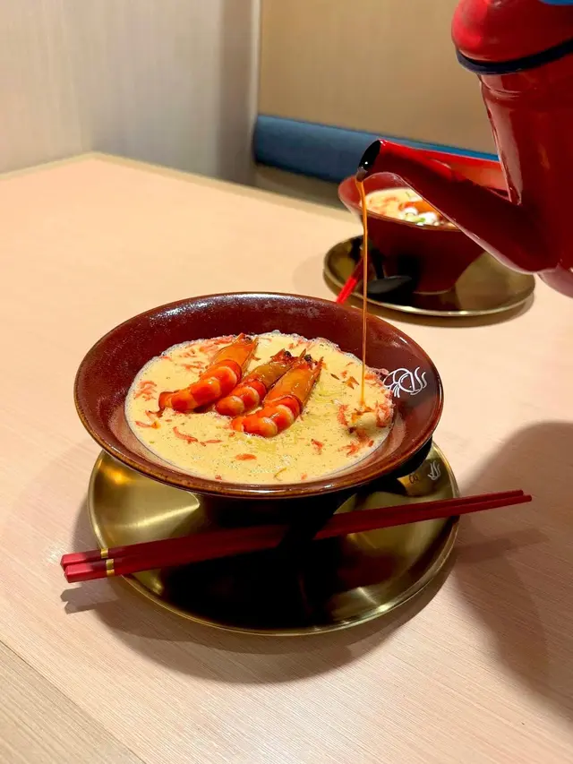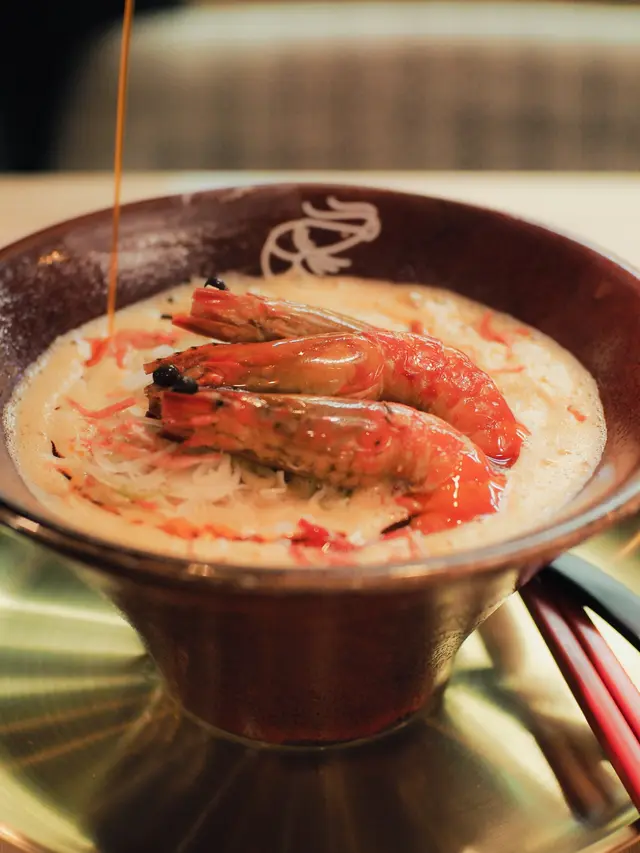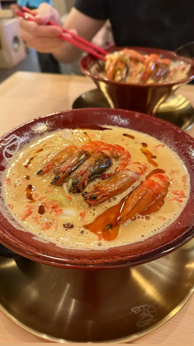 好耐之前都已經聽講過喺尖沙咀分店嘅人龍,知道佢開咗過嚟港島都已經book mark咗一段時間想試啦,星期日嘅晏晝唔使等位,但舖頭入面長期都係坐滿人嘅狀態,證明人氣非常高😌😌$118 醬油蝦濃湯麵🦐只係得呢一款湯底,麵底可以揀刀削麵或者拉麵。試晒兩款覺得拉麵比較襯呢個湯底多啲,同埋好掛湯,而刀削麵就比較煙靭有口感,但相對就冇拉麵咁掛汁。個湯濃到不得了🥹然後因為今轉蝦嘅size比較細所以一碗有五隻蝦😬啲蝦係事前醃好咗 有少少微辣 好惹味🥺我哋再加咗一個醬油鮑魚同蟶子 每款$38 味道同個醬油蝦差唔多但個size係對得住個價錢食到差唔多最後店員會問要唔要櫻花蝦油飯,強烈建議一定要試 撈埋個濃湯😬 呢餐真係完美!…查看更多