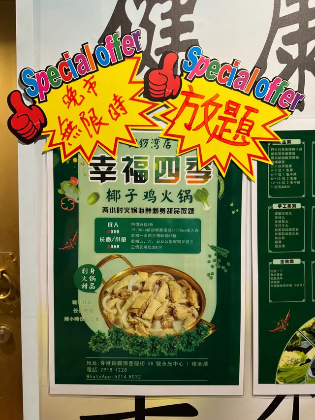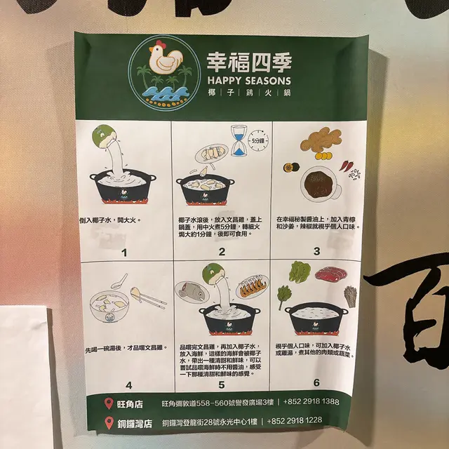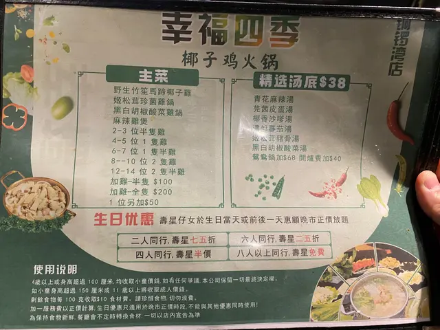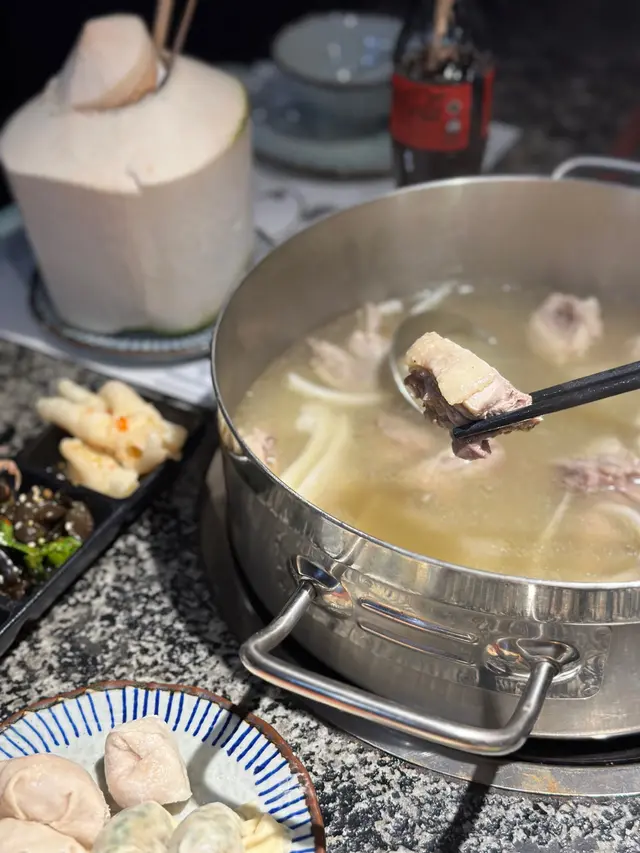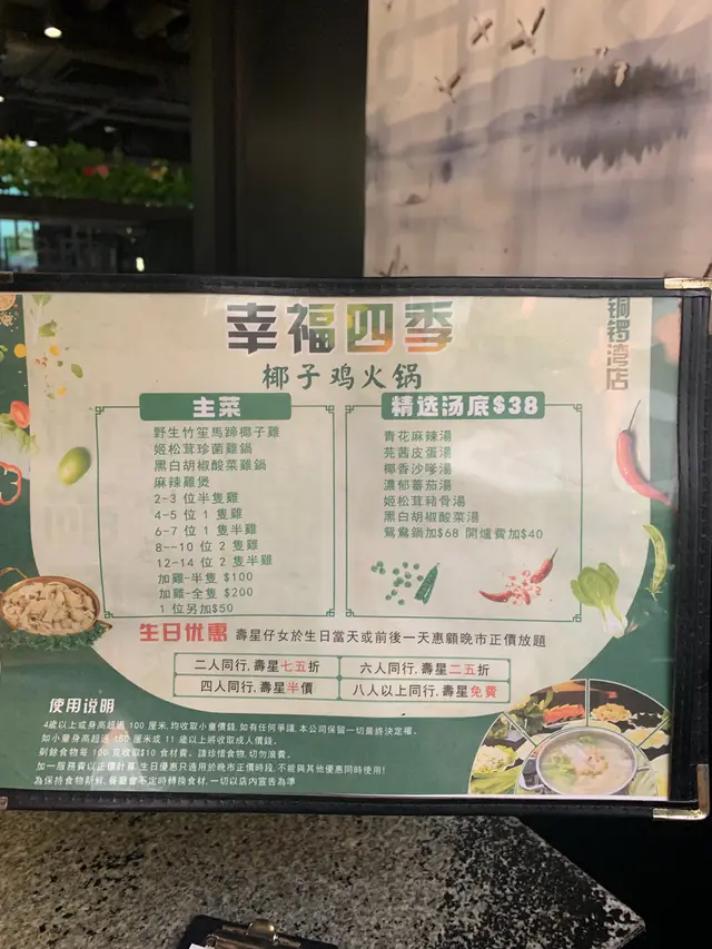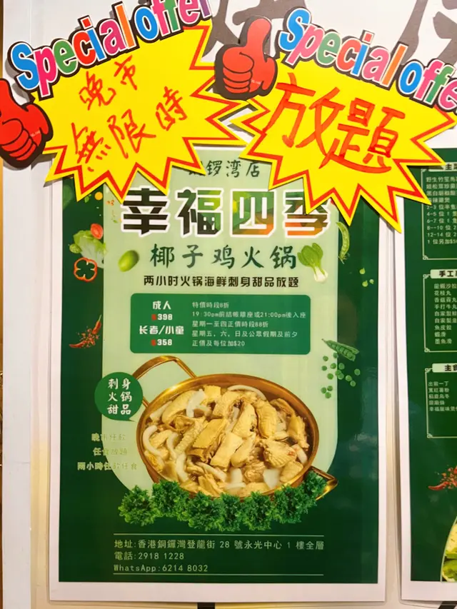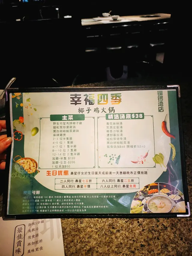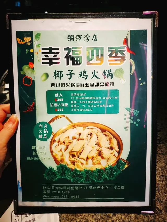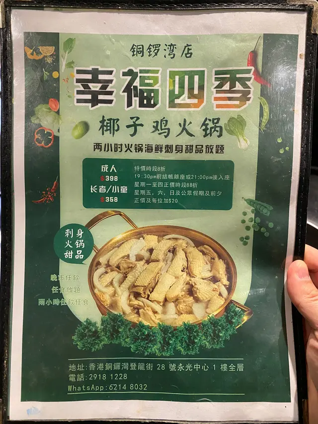 這間餐廳之前是做椰子雞火鍋單點的,最近轉成了做放題,不過能吃出椰子雞的水平沒有變差,再加了很多配料,小食任食,所以性價比還可以!而且還有一個大賣點,就是有部份小包廳,比較有私人空間,不受其他人打擾!椰子雞火鍋放題(398元)正價時段88折,特價時段8折一入座就會有一個椰子雞鍋給你,兩人就半隻,雞不算很大隻,不過就挺有雞味的,而且不會太肥,肉質挺嫩滑的。聽店員說是用文昌雞。煮雞的湯底是椰青水,味道非常清甜,煮完雞以後還帶點雞的香味,非常對廣東人的胃口,我跟朋友都差不多喝光湯底了!椰子雞吃完就是加湯底吃火鍋,都是些常見的火鍋配料。牛肉有兩款,分別是牛板鍵和牛頸脊,油花都挺不錯的,前者嫩一點,後者牛味濃一點。另外還有我挺喜歡的胸口油,大大片,吃起來爽滑,又不油膩!而這裡的韭菜餃和鮮蝦雲吞都挺出色的,味道都很香濃,雲吞爽滑!海鮮這裡也有,叫了蜆,大蝦和白鱔片都非常新鮮,蜆完全無沙,非常鮮甜!蝦和白鱔片都爽滑!另外還有點炸物,小吃,如無骨鳳瓜,醉鴨舌等都挺有質素的!愛吃飯的一定不要錯過這裡的臘味煲仔飯,每次給你一小碗,但都包括了很有多臘腸,臘肉等, 臘味煲仔飯獨有的油香這能做出來,而且還有飯焦,味道鹹香惹味!吃到最後還可以吃甜品,也挺多種類,其中焦糖燉蛋,椰汁涼粉,椰子奶凍都挺不錯!不是工廠貨。…查看更多