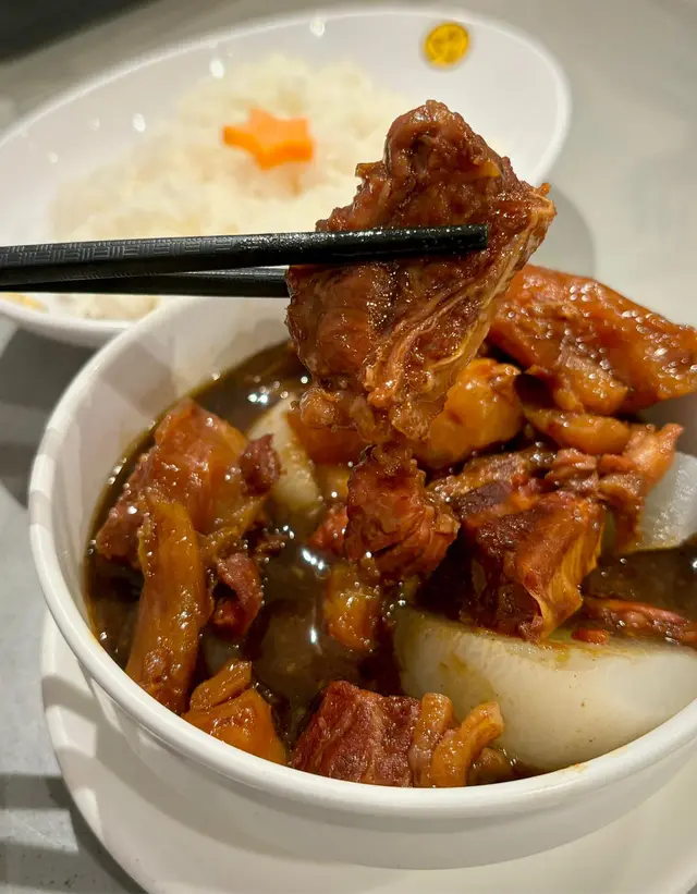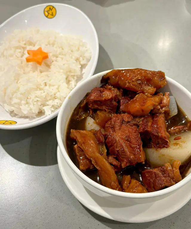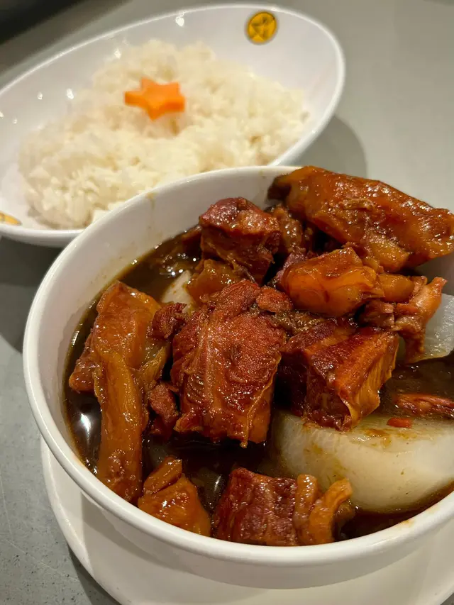 經過銅鑼灣,唔知食咩好,見到有間港式餐廳,一於試下啦!餐廳環境光猛,感覺新淨,坐得幾舒服😌唔錯!蘿蔔牛筋腩飯 $89本身諗住求其食,冇抱任何期望。點知一上枱見到色澤好靚,牛筋腩咬落超級腍,仲要好入味,醬汁味道完全滲入筋腩之中😋有驚喜喎!而且牛肉有鮮味,肥瘦適中,good😆飯份量好多😝上面仲有粒星形紅蘿蔔,配合返店名「幸運星」😆好得意😆凍檸茶 +$3茶味濃郁,飲落口感清爽,質感順喉,有少少檸檬皮嘅苦澀味,好鐘意😋迷你蛋撻(跟餐附送)一入餐廳就比門口嘅蛋撻吸引,啱啱出爐好香,嫩滑嘅香甜蛋漿,加上香脆曲奇皮,散發住濃郁蛋味,真係好正🤤餐牌✨查看更多