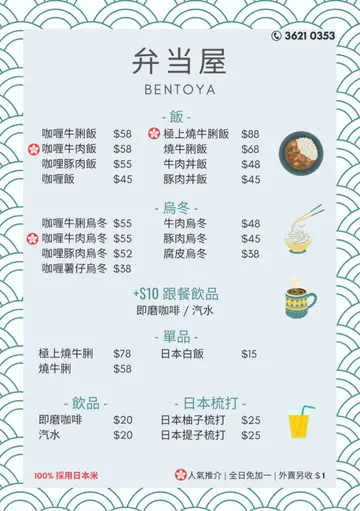 從千色滙天橋行去荃豐中心時,在天橋望向荃豐中心商場地下,發現有間新小店,好奇之下,反正未吃飯,試試新嘢先⋯⋯點了一個下午茶及晚餐餐牌變化不大,飯系列是日式咖哩,可以選擇另加$8蛋包飯。還有烏冬及茶餐系列日式定食及丼物唔飲嘢,有綠茶提供