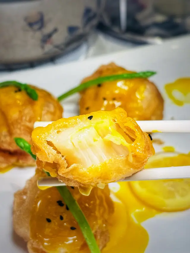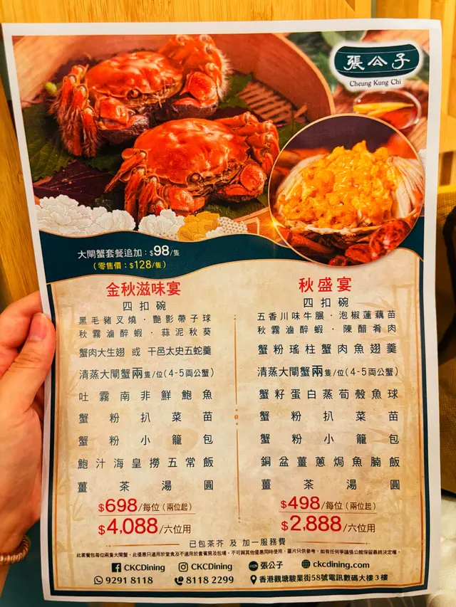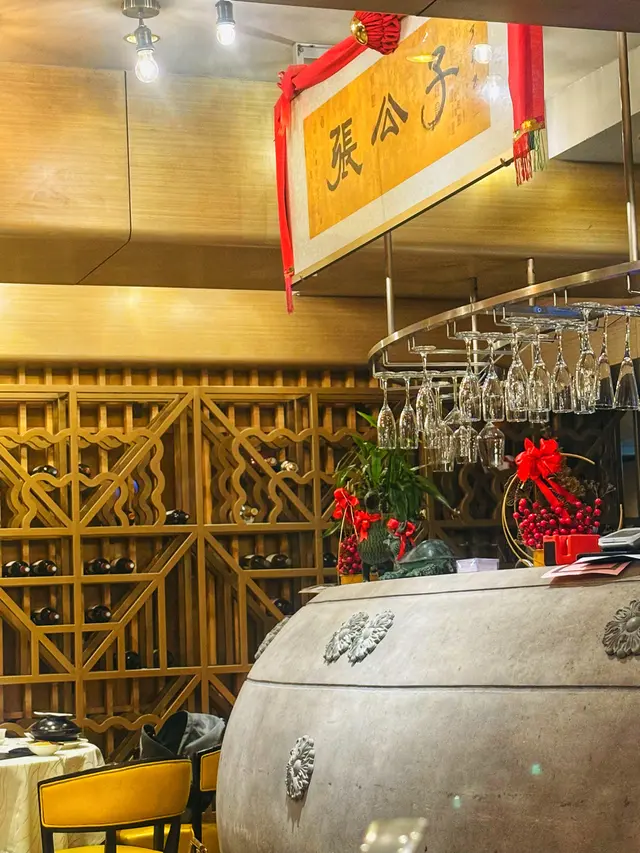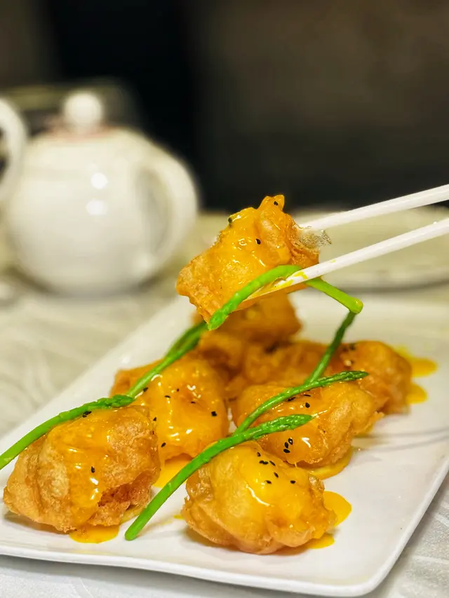 一進門口就看見餐廳的牌點和石造的櫃檯,霸氣十足呢!餐廳內的裝飾和掛畫配合帶點詩意的菜式名稱,而菜式造型更是賞心悅目,充滿驚喜和儀式感!最近餐廳還有新的餐牌來迎接秋天起,大閘蟹的到來,主打以蟹來主題的菜式,喜歡吃大閘蟹的一定不要錯過啊~♡秋霧鹵醉蝦$128菜式名充滿詩意,飄着仙氣來的滷醉蝦,酒味適中,沒有搶到蝦的鮮味,蝦肉肉質彈牙。♡艷影帶子球$238 🥢必點🥢帶子十分大粒,外皮炸得香脆可口,每粒帶子球上面都有一條蘆筍,中和一點油膩感,而醬汁帶一點閃閃發光的感覺,酸酸甜甜開胃又惹味,推介!♡火焰菠蘿蟹黃炒飯$238職員把菠蘿送上後再在菠蘿點火,瞬間菠蘿就整個燒着了,變身成為火焰🔥菠蘿。菠蘿裏放有炒飯,內裏的菠蘿粒很多,喜歡吃菠蘿的一定要點,感覺菠蘿味比蟹黃味更突出。♡蟹粉扒菜苗$188最近是大閘蟹的季節,所以點了一個有蟹粉的菜式,金黃色的蟹粉份量不少,味道香濃,在蔬菜上加上蟹粉顯得高貴起來唷!糖水有咋喳,裏面的料十分多唷~每一口都可以吃到,真材實料的感覺。
