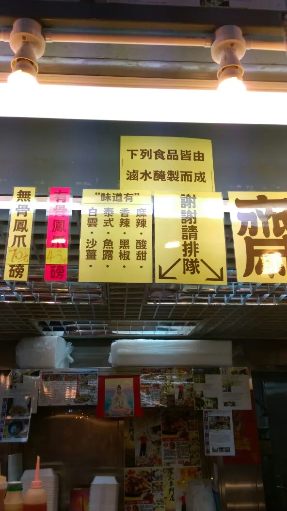 人性化的滷水小吃 Glacierz等級42016-09-033K 瀏覽 關注 我都係經朋友推介同各大傳媒先識強記大名,試過一次自此以後都有再惠顧。一次平日放工時段買,另一次係星期日下午時間買,分別在於排隊時間快與慢,但服務唔會因為人多而敷衍客人架老闆娘話平日6:30前要買,遲左部份搶手小吃就會賣光光。最出名的鳳爪必點,有骨$43/磅,去骨$70/磅,價錢比其他街市檔口更貴。原味鳳爪事前由男老闆浸過滷水,不加調味都可以空口吃。想調味亦有8大款選擇 (白雲 沙薑 泰式 麻辣 魚露 香辣 酸甜 黑椒),甚至可以要求混味∼中麻辣味半磅,沙薑混魚露半磅:點解稱為人性化呢?除左味道自由可以要求之外,一個價錢又可以拆幾份幫你調味分盒。老闆娘會問客人辣要大中小,要唔要麻油芝麻等等,令我覺得麻煩到人地添 睇住一大匙滷味放份膠盒,佢地好細心會合埋蓋倒返水份唔呃稱而且,醋汁都有兩款,辣味配甜辣醋,唔辣既配甜酸醋。鳳爪的皮非常爽,有點類似泰式鳳爪的口感,作佐酒小食一流。因為係白滷水味道唔會濁,各種香料配合不怕喧賓奪主。小麻辣半磅:白雲半磅:沙薑一磅:令我最驚喜的是雞膝頭軟骨。或者用既雞比較年輕,骨頭軟骨輕易就可嚼開,口中感覺清爽不會有骨碎的嚼感。同時細細粒特別吸調味,個人推薦麻辣味,有重慶街頭燒烤的調味粉味道! 辣度方面唔食辣的人食小辣都可以接受,若然食慣辣可以由中辣開始。老闆娘建議醋不要直接倒入膠盒,其一辣味會沖走,其二蒜味會蓋過滷水味。下次經過大埔bbq或踏單車買一盒加料都幾好∼…查看更多+ 2以上食評乃用戶個人意見 , 並不代表OpenRice之觀點。1分享人性化的滷水小吃 強記鳳爪 https://s.openrice.com/QrbT0C5Ge00檢舉 張貼 評分4味道3環境4服務4衛生3抵食推介美食麻辣雞膝頭用餐途徑堂食