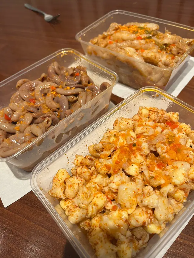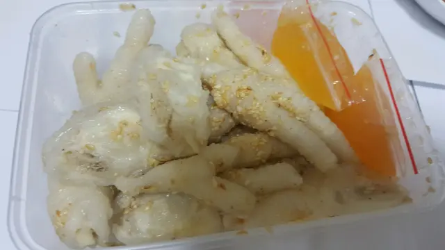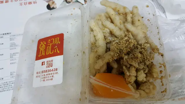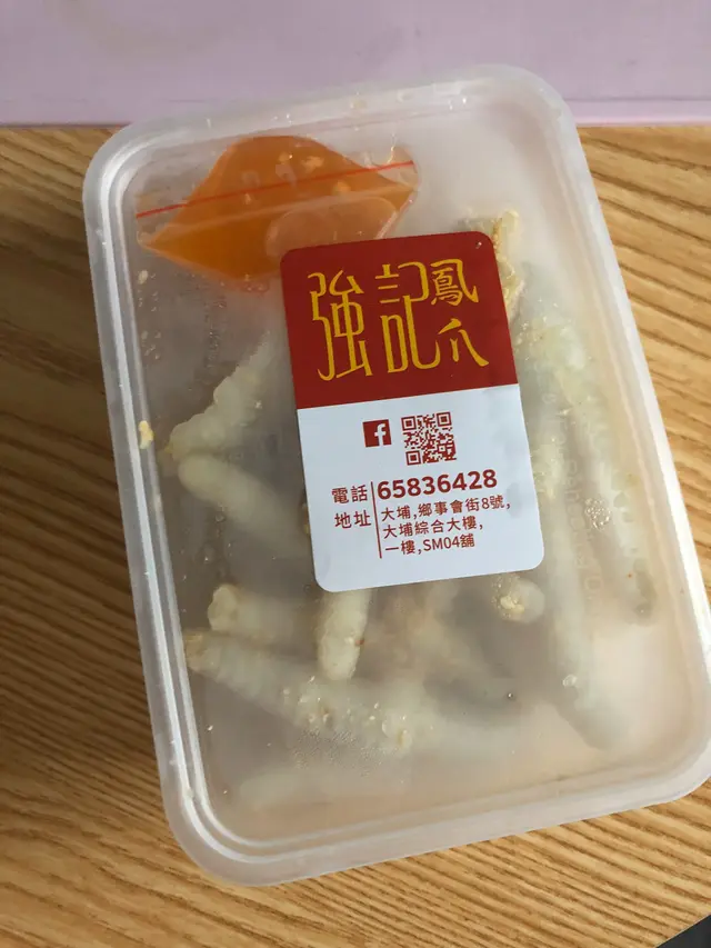 開心買鳳爪 Piglet Lam等級32018-11-192K 瀏覽 關注 家人建議我去強記鳳爪店買 無骨鳳爪。 到了後才發覺有其他食品 (腎,粉腸等等), 好吸引,所以我沒有留意有價錢牌,亦不知道用什麼行量。 見到美味食物就失去理智!.店內叔叔十分友善,耐性地介紹每種食品。 心多多的我就買了無骨鳳爪,豬軟骨,咖哩齋和酸齋。 選擇了無骨鳳爪和豬軟骨後,就要選舉調味, 我選擇了泰式,但叔叔好好人,額外給我 麻辣 和 酸甜 各一包。 .一磅無骨鳳爪和豬軟骨$76,初初感覺都幾貴,但再想想在餐廳裡的價錢就覺得超值了。 鳳爪十分爽口,調味料味道酸味剛好。 建議享用時再攪拌,味道會更均勻。 齋的味道就普通,但不防一試。…查看更多+ 3以上食評乃用戶個人意見 , 並不代表OpenRice之觀點。讚好分享開心買鳳爪 強記鳳爪 https://s.openrice.com/QrbT0M1Sn00檢舉 張貼 評分5味道5環境5服務4衛生4抵食推介美食一盒約一磅無骨鳳爪$76用餐日期2018-11-08用餐途徑堂食用餐時段其他