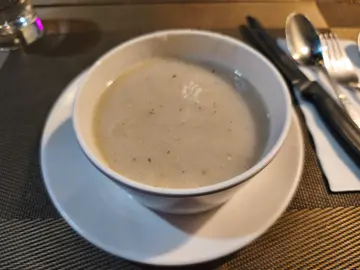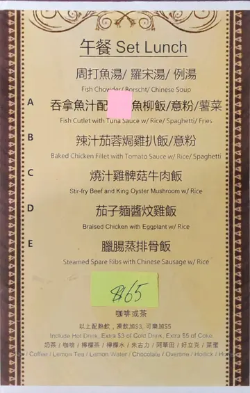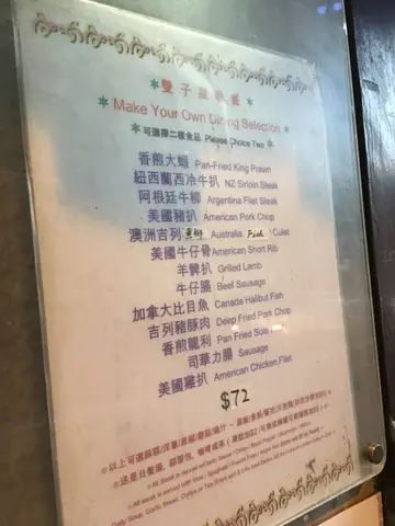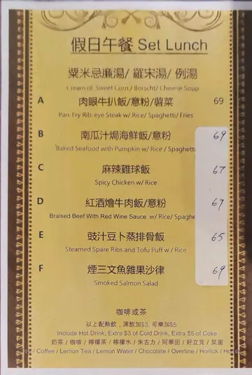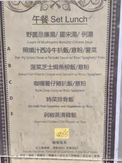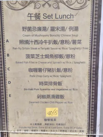 下晝一點,一個人在中環區找地方吃午餐,周圍都排哂隊,行到半山區看見這間港式懷舊西餐廳,午餐也不貴($65),便進來試試。一進來,店員便說明今日的例湯是青紅蘿蔔湯,我點了白湯,A餐(照燒汁牛扒配薯菜,熱鴦)白湯:澱粉湯,冇咩味,有點後悔冇嗌紅湯或者例湯牛扒餐:大大份牛扒,應該超過240g,好抵食,薯條夠熱但未算好脆熱鴦:正常環境方面算坐得舒服,店員唔會因為你一條友逼你坐細位。總括而言,這個區域這個價錢這個份量,性價比高。參考番:上次西九龍中心的紅蔥頭食幾乎完全相同嘅野要$73