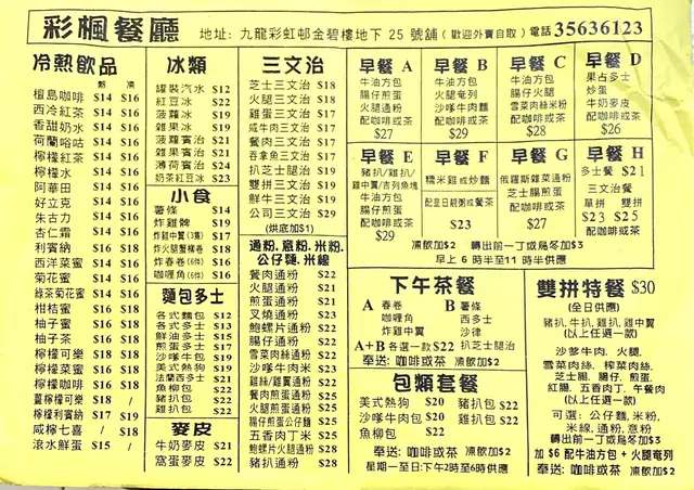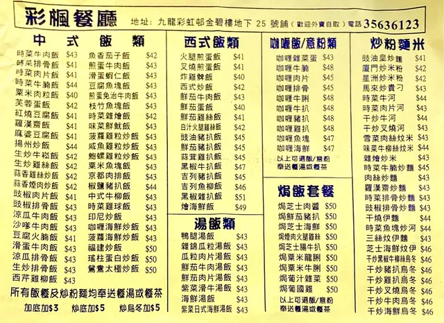 彩楓餐廳 (彩虹) 網址: https://s.openrice.com/QrbS01MK000 地址: 香港彩虹彩虹村金碧樓地下25號舖 電話: +852 35636123