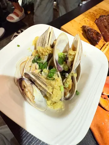 第一次去感覺似入咗間居酒屋,好熱鬧,好有氣氛,老闆娘好熱情招呼每枱客人,佢會遂枱傾計問吓啲嘢啱唔啱食,又會推介有咩抵食好食。講返食物先,我地一行三人,先上枱嘅係芝士焗什菇,因為成8點幾剛放工,所以係一輪狂風掃落葉式被KO,陸續上串燒、焗蠔、同牛扒套餐。個牛扒套餐2百幾蚊,竟然仲要送全隻波士頓龍蝦同一大兜大大隻嘅酒煮大蜆,仲要係質素十分高,肯定唔係cheap貨。焗蠔上枱仲要有兩款口味,芝士同蒜蓉同樣肥美多汁。串燒就真係一定要食燒鱔同燒茄子,真係兩樣都不得了,茄子真係心機之作,每一啖都係平均佈滿香料,非常惹味。鱔就係要encore 再encore之選,皮脆肉滑,非常肥美。最後,我仲買咗即食日本蠔同海膽返屋企食,加上第二日約咗啲老人家去拜年,買咗好多生果,同樣高質,非常值得推介比朋友。