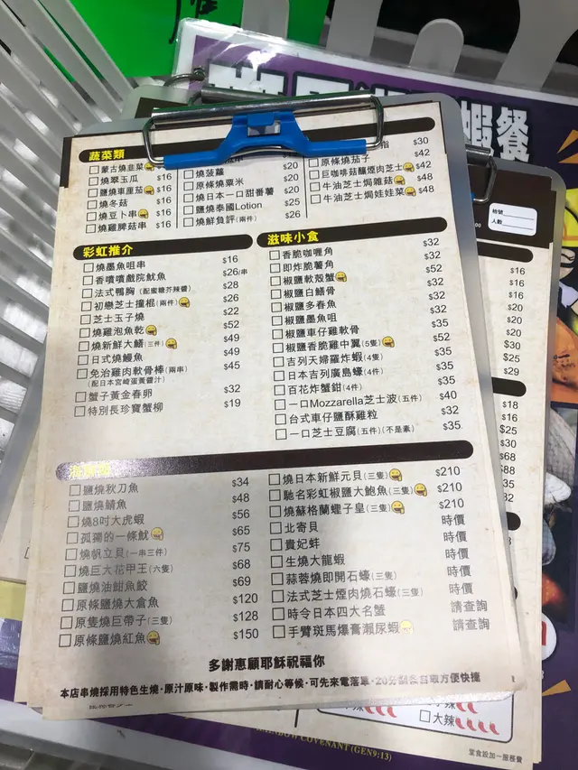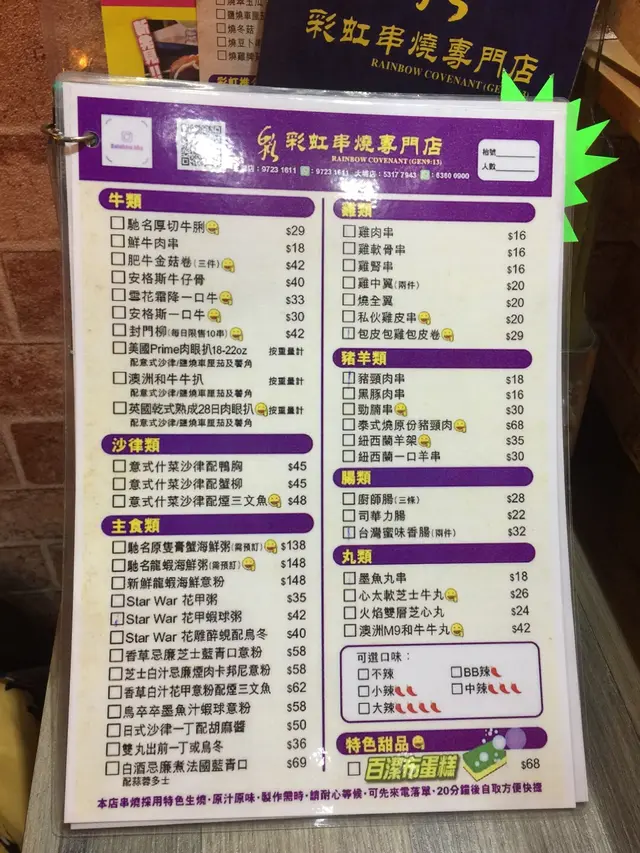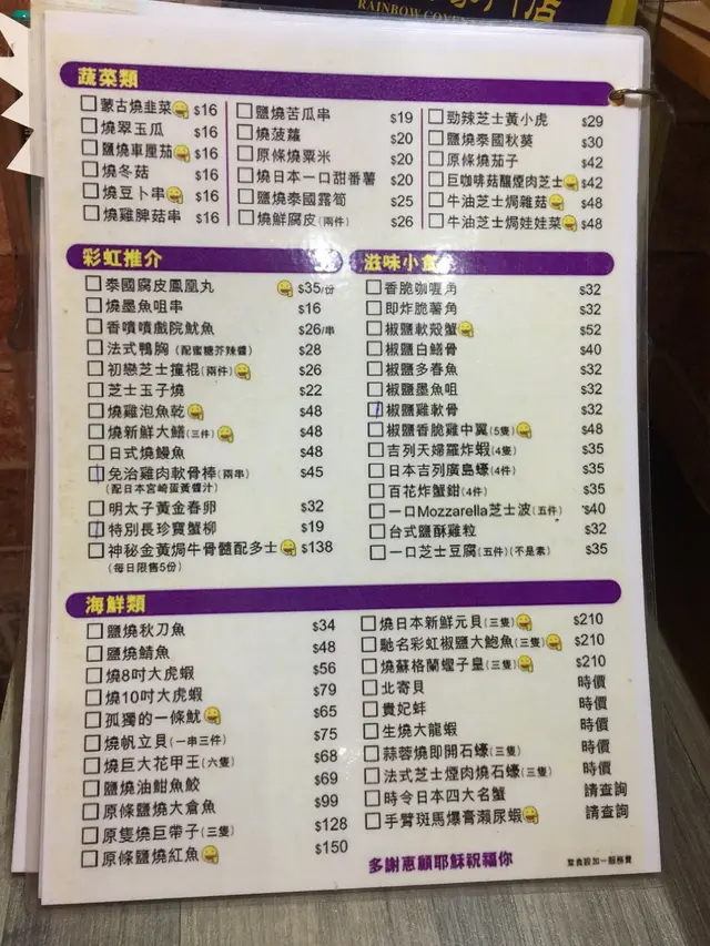 有良心的店買小見小,彩虹串燒做到5月尾就結業了,係最後的星期五,同朋友趕尾班車來試下 。Book左7點,去到好多人,等左一陣先入到去。睇menu﹐有d名都幾搞鬼