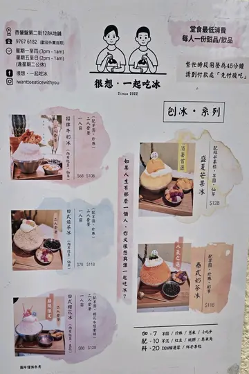很想 · 一起吃冰 (西環) 網址: https://s.openrice.com/QrbS0YSqB00 地址: 香港西環西營盤第二街128號海昇大廈第二座地下A號舖 電話: +852 97676182