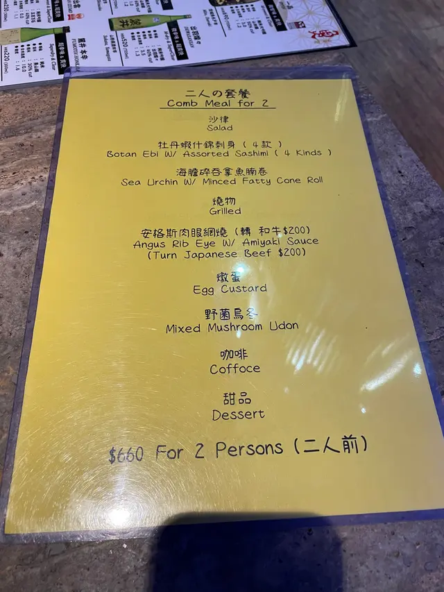 Omakase set👨🏻🍳 $660/2位個set有沙律、刺身🐟(深海池魚、石鯛、牡丹蝦、目張魚)、碎吞拿魚腩飯、銀鱈魚西京燒、安格斯牛扒、茶碗蒸、野菌烏冬同雪糕(有抹茶同紅豆揀)👐🏻沙津個汁夠酸 超開胃刺身幾新鮮😉迷你飯啖啖都係碎吞拿魚腩個銀鱈魚掃咗燒汁燒得好香牛扒略嫌熟 韌咗啲茶碗蒸滑嫩🥚食埋熱辣辣烏冬再以香濃嘅抹茶雪糕收尾🍵🍨不得不提 呢到嘅店員好有禮貌👍🏻…查看更多