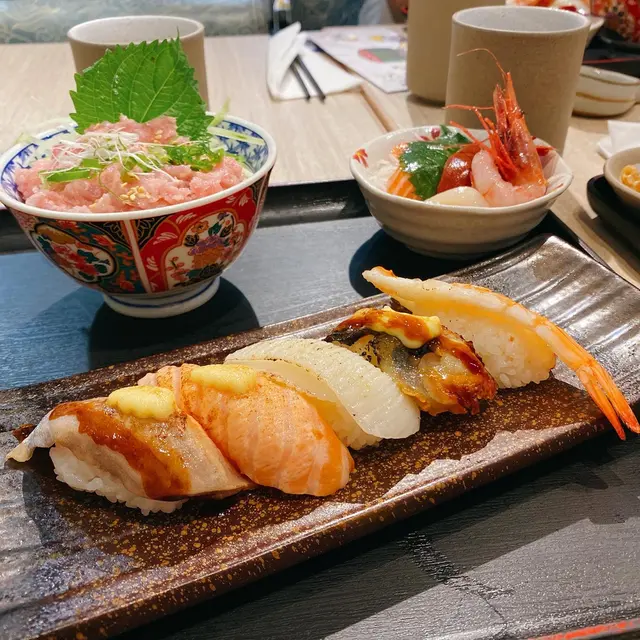 迷你三文魚粒粒海膽飯拼火炙壽司