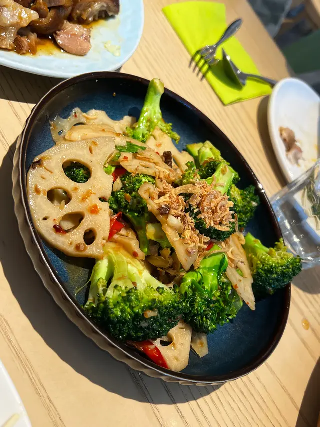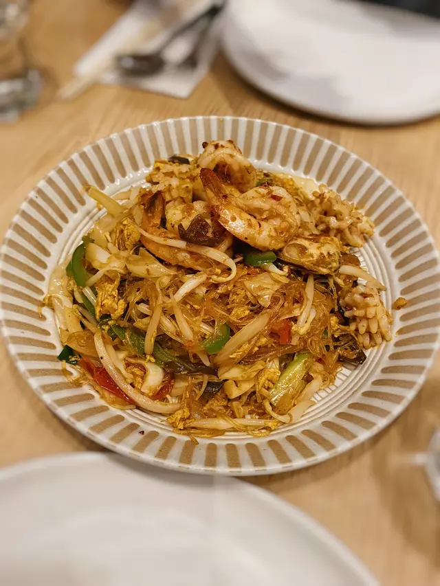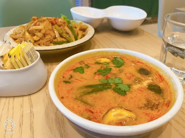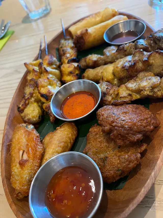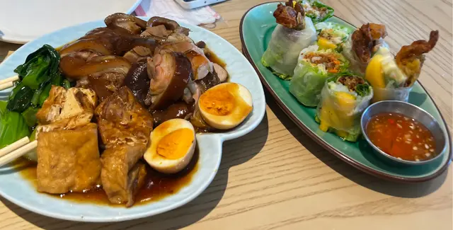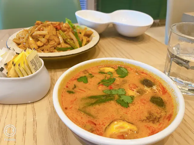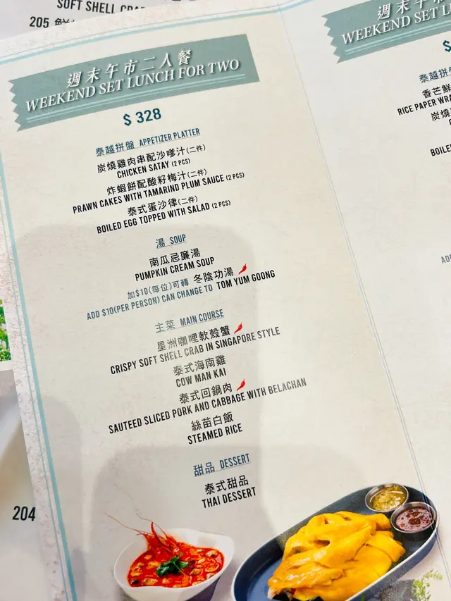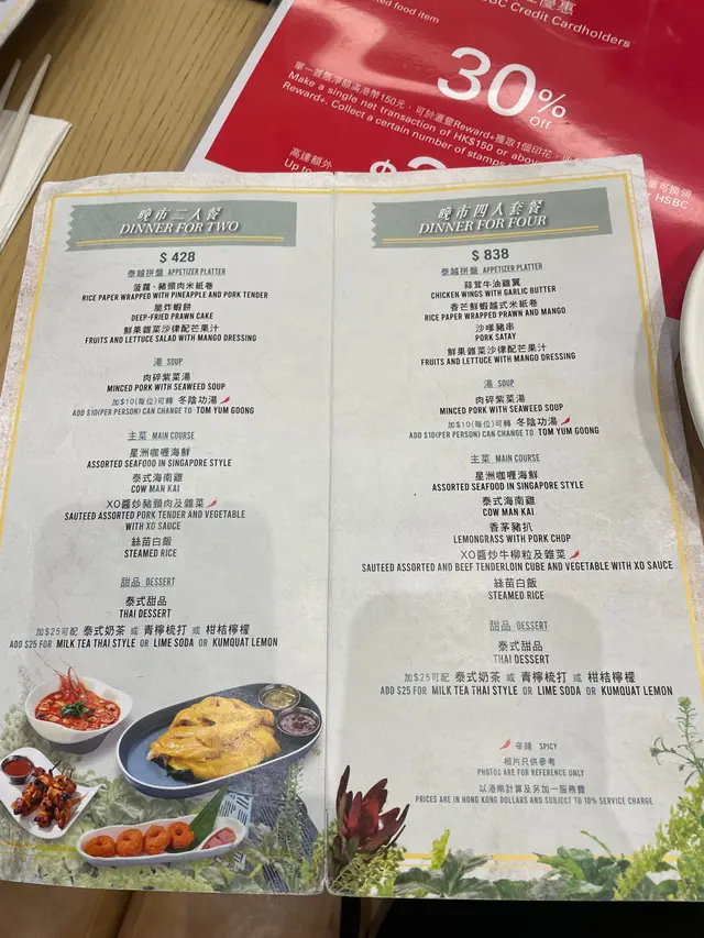 觀塘一日到黑都好多人,好多時間都要排隊,最近太熱唔想係外面排隊,就選左間係商場入面既泰菜,諗住坐得舒服D。門面唔大但原來入面好大,佢係L 形佈局所以睇唔到。甘我地都比較肚餓,就叫左個晚巿二人餐,睇黎都幾多野食,份量都唔細!首先有個小食拼盤,每樣小食都配唔同既醬汁,個沙嗲醬做得好好,配串燒一流。春卷炸到脆身,入面係蝦肉都幾正,隻汁就係似泰式辣醬甘,幾開胃。米紙卷就不過不失,無話好好食,串燒幾惹味,肉質仲係滑既!唔錯!冬陰公湯酸辣味重,仲有好大隻蝦仁,好開胃,依個讚!炒雜菜黎講個配搭都幾特別,係蓮藕,秋葵,木耳,粟米筍,豆角等等,味道唔錯有少少鍋氣,而蓮藕炒到爽脆,係幾好食既,夠曬清淡健康!海鮮咖哩隻汁係似咖哩蟹甘用蛋汁收芡,味道係甜咖哩,配搭上唔同既海鮮,都真係唔錯。就甘輕輕一數都有5種海鮮,青口,蟹肉,魚片,蝦,魷魚等等,依個菜可以撈飯吃,幾下飯👍蒜香骨就略嫌失色,雖然好大舊但係肉質比較硬,骨位比想像中多,肉既話得幾舊。蒜味亦未有好特出,面頭既炸蒜份量本人覺得唔太夠,未食完碟菜下面既肉已經無曬蒜味。整體黎講加一大約500蚊既話有d 貴,可以一試,如果再試既話可以試炒野,隔離既炒飯聞到好香應該唔錯。…查看更多
