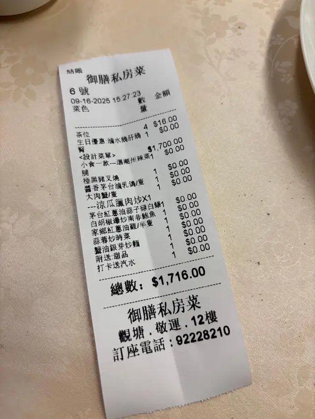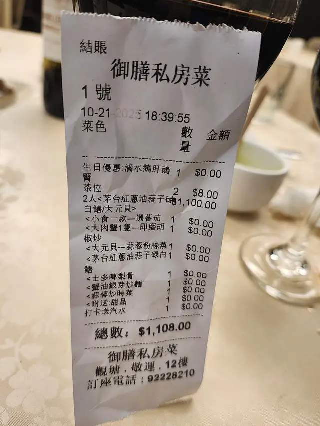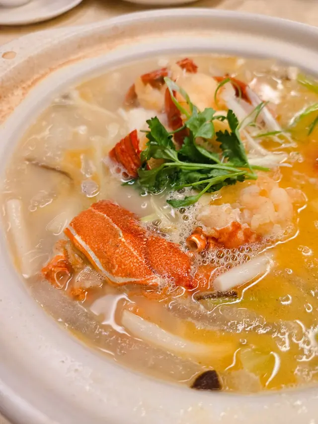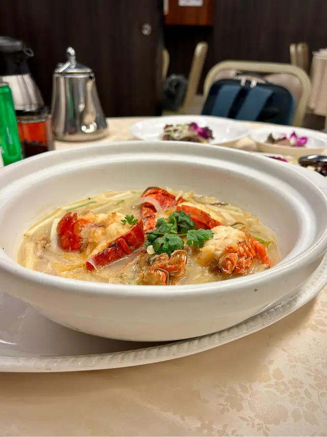 朋友最近生日,我專程同佢去咗觀塘嘅「御膳」食飯。與別不同之處,這裡竟可自訂菜單,讓我們提前設計了一餐啱心水嘅海鮮餐。免開瓶費,自帶的幾支酒,侍應立即奉上冰桶酒杯,令人讚賞。店家推薦「茅台紅蔥油蒜子碌白鱔」,煲仔上桌香氣四溢,熱氣騰騰,原粒蒜子配搭茅台香,白鱔外脆內嫩,鑊氣十足,真心推介。芙蓉海寶炒龍蝦球賣相精緻&非常足料,用咗兩隻龍蝦起肉,龍蝦肉入口爽口彈牙,與花枝蝦球炒,好好味。龍躉骨雜菌豆腐湯奶白色魚湯底鮮濃醇厚,龍躉骨邊肉細嫩,豆腐滑溜,雜菌增添口感。真材實料,每一口都是精華!古法蒜子焗大肉蟹煲仔上桌「炸炸」作響,蒜香撲鼻。原粒蒜子焗至金黃甘香,大肉蟹飽滿鮮甜,蟹肉緊實吸盡蒜香。鑊氣十足,無需醬汁,單單鮮味已令人回味!汕頭滷水鵝鵝肉深浸滷汁,色澤油亮。入口鹹香恰到好處,肉質軟嫩不柴,脂香豐腴。滷汁醇厚回甘,送酒佳品!生炒臘味糯米飯香氣撲鼻!糯米飯油潤甘香,臘腸油香滲透每顆米粒,飯粒煙韌彈牙,加上醬油炒香,鑊氣十足。店家不僅送上抹茶布丁,因我們慶祝生日更贈滷水鵝肝鵝腎。上傳美食照還獲贈汽水,加分。今餐都幾滿意,下次有機會嘅話,都會再嚟。…查看更多