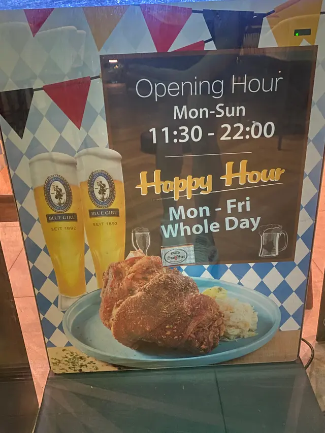 今日我朋友收到coupon後,諗住試下哩間餐廳,點知餐廳話唔比用話,28號先用得??? 吓,張coupon無寫幾時先開始用喎? 老實同得大啤酒牌子合作,竟然唔承認coupon? 不如你唔好同啤酒公司合作啦。最後有叫散叫德國火焰豬手,面果浸肉做得好鞋,內裡先正常,5蚊雞隻雞直頭燒燶晒沙律,三文魚意粉正常,乳豬唔錯。因為懷疑鋪頭趕收工,8點半唔比叫飲品,9點係咁收碟,係咁趕你走。真心無下次。
