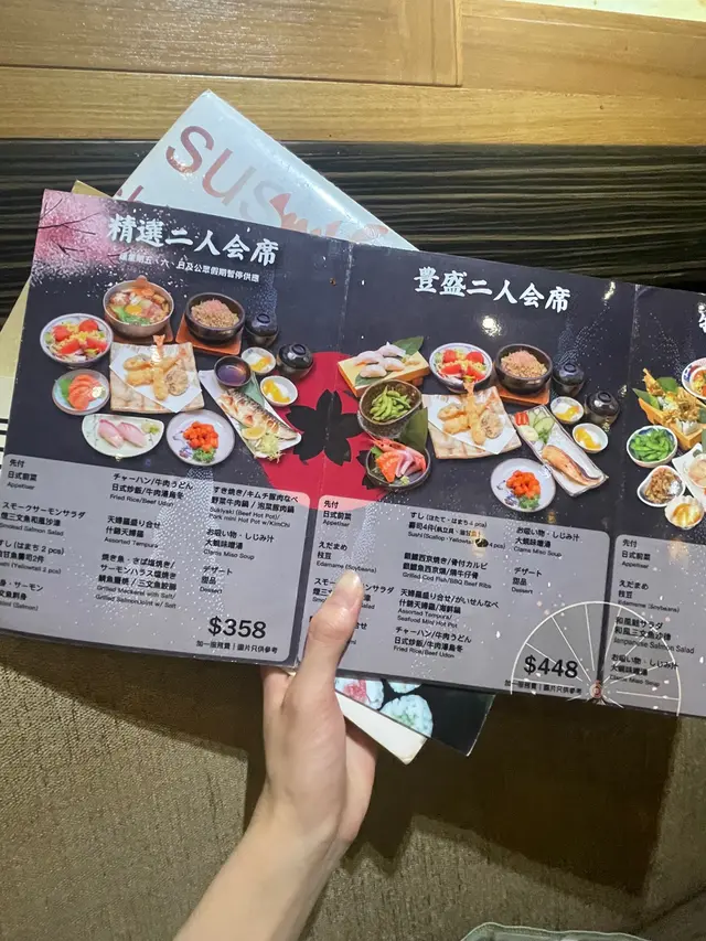 一定再訪 非常滿足的一餐✨價錢略高 刺身超厚 頗高質素豐盛二人餐👍🏻連甜品有十款食物 四百多塊 cp值很高(餐)日式前菜 枝豆 味噌湯普普通通👌🏻(餐)三色刺身✨蝦非常鮮甜 兩款魚都有1cm厚 夾起來嚇一跳的厚度😂(餐)和風沙律 沙律醋有點苦🧏🏻♀️(餐)黃金汁焗蠔🧏🏻♀️蠔偏小 而且我那隻的質地有點軟爛這個品種不太適合焗烤(餐)大蝦天婦羅✨有4隻 來不及拍就先吃了 非常好吃很大隻很甜 麵衣鬆脆 推薦!(餐)士多啤梨汁配鵝乾多士👌🏻中規中矩吧 士多啤梨汁是乳酪不算很突出(餐)日式炒飯出奇地好吃 很香 味道豐富👍🏻蟹肉蟹膏軍艦👍🏻料超多超滿足 蟹膏味道超濃炙燒左口魚壽司✨一定要點 入口即化 油脂味超濃厚三文魚親子卷👌🏻很大 勉強能一口吃掉 可是味道一般吧餓的時候可以點雖然整體單價偏高 可是份量真的很大是令人有滿足感的壽司店✨