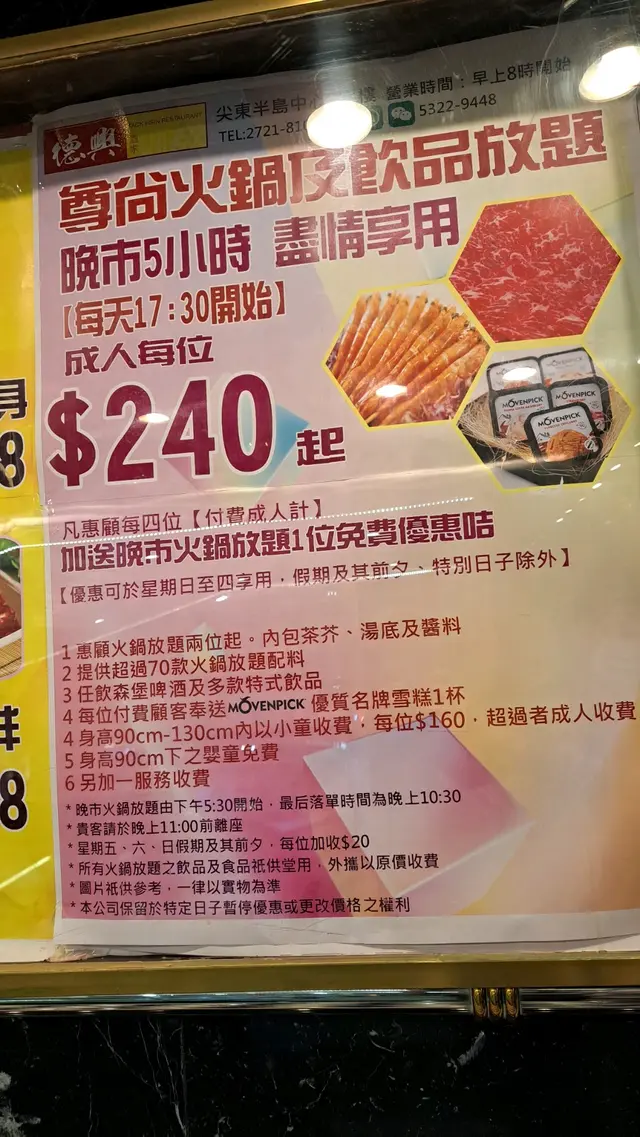 二百幾蚊一位打邊爐放題,任飲任食,包埋任叫海鮮例如鮮蝦、青口、帶子等等,另外任飲嘅酒水絕對係驚喜,除咗一定會有嘅Soderberg啤酒,佢仲會有貴價啤酒任飲,我試過有Hoegaarden Rose、日本Premium天然水生啤酒、1664 Blanc白啤等等,真係每次去打邊爐都會有驚喜。呢間係傳統港式酒樓格局,用圓枱,所以地方好闊落,約埋一大班朋友一齊打邊爐高談闊論,渡過美好嘅時光。呢度仲可以由六點坐到去佢10點幾收舖,真係一個價錢可以任食兩餐。仲包埋Mövenpick雪糕每位一盒、任食糖水兩款。相比起出面嘅90分鐘放題食到趕頭趕命真係貼錢買難受,所以呢度真係冇得輸、冇嘢可以投訴。…查看更多