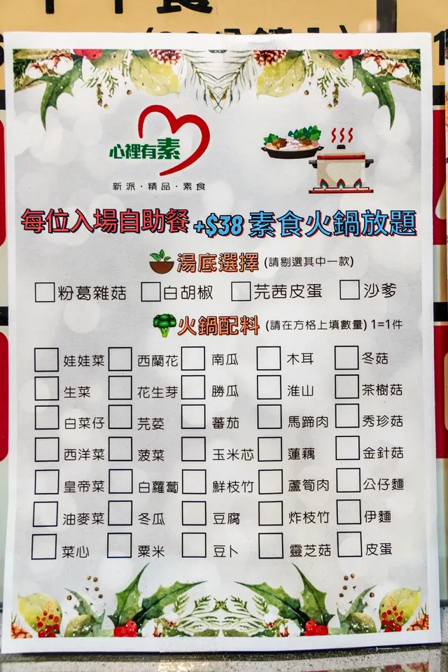 天氣凍凍地,好自然會想起火鍋。但,食素的人士,在香港要找一間合心意,也就是素食的火鍋店,實在是不容易。農曆新年期間,在網上看到了這一間《心裡有素》的宣傳,說有自助素食火鍋。我同太太就選了一個能交低小孩,可倆口子出街的星期六來試新店。可是,執筆時,小店已經頂不住租金的壓力,連後來的白武士都幫唔到幾耐,最終結業了。《心裡有素》其實是一間很普通的素食自助餐餐廳。那天來到,店員先是推介我們吃下午茶時段的素食自助餐。而火鍋,卻是自助餐價錢再 top up 上去的,所以,我們來到,就可以一口食食晒自助餐同非自助,但是任點的火鍋。先說自助餐的東東,其實可以說是沒什麼可以驚喜。因為食物的選擇,很大眾化。當中,當然有人見人愛,但有點點飽肚的素食炸點。簡單的小菜類食品,看起來似是一些大家去到佛堂參佛,佛堂內眾姨姨幣心煮出來給信眾們午、晚餐的食物出品。茶葉蛋、蒸水蛋及炒菜,,是不突出的食品。但以平平地,能令周邊素友兩餐溫飽的話,這種出品,算是 OK 既。火鍋盤未來到,我同太太就先食自助餐的東東,先把肚填好。大家都是簡單地吃幾個炸點,配以炒麵。若不是點了火鍋,這一個自助餐中,我們基本上只會吃炒麵。因為,也可以說是奈何,炒麵是眾自助餐點中,最好食的一樣東東。火鍋來了,我們選的是沙爹湯底。這沙爹湯底,看得出是自家製的。因為散發出來的香氣,有非常濃的花生香,再有的,就是芹菜的香味。成個湯底就是以芹菜同自家製沙茶醬來撐起,令我們吃好之後,不加點蔬菜了,直接喝上兩、三碗火鍋湯更開心。火鍋也是自助的,但更貼切的形容,是放題。我們在火鍋紙上剔剔剔,主要都是剔一些蔬菜及菇類。出來,就是一大盤的菜,很是壯觀的。店姨姨說,食完可以再添的,但當我們看見這一個份量,心中已經說,一盤就夠了。沙爹湯底,好配合我們所選的蔬菜及菇類。當中,油豆腐 (也就是豆腐卜),把沙爹湯盡吸在內,味道香甜得無比。食晒所有東西之後,沙爹味仍殘留在口腔內,很是好。之後,店姨姨說仲有甜品同水果。蛋糕同紅棗糕都好好味道。尤其是紅棗糕,是純紅棗的甜味,若不是飽,我們會多吃幾件。最後說的,是飲品。好絃種飲品的吸引,都食健康。多吃了炸點,多吃了火鍋料,熱氣的話,都健康解火。當中的新會十五年老陳皮茶,是店姨姨極力推介的,不甜,但飲後立即感生津止渴。另外的鮮菠蘿蜜糖特飲、羅漢果紅棗茶同黑桑葚山楂茶,都好好。單以素食自助餐來評,就真係普通到冇得再普通了。而火鍋,雖然都是簡單食材,但所有蔬菜都夠新鮮,湯底又夠正,值得給回一個開心的讚讚。…查看更多