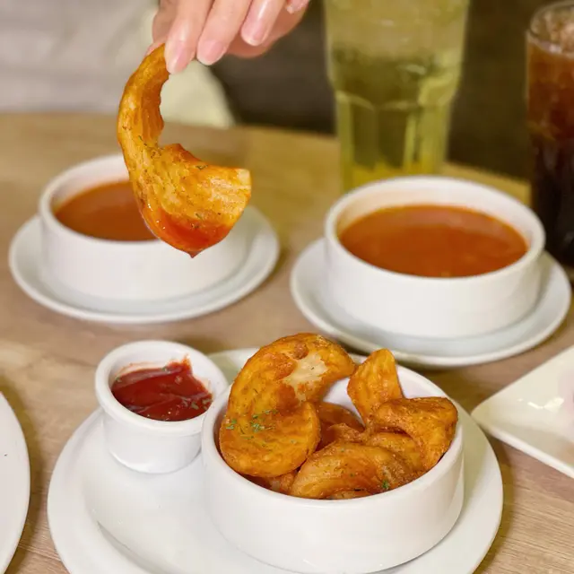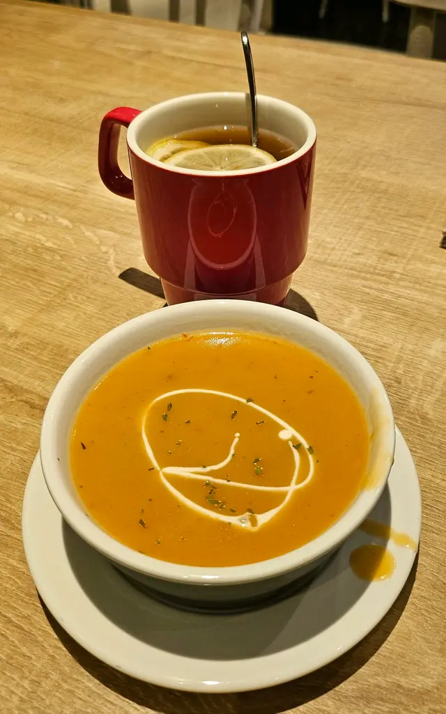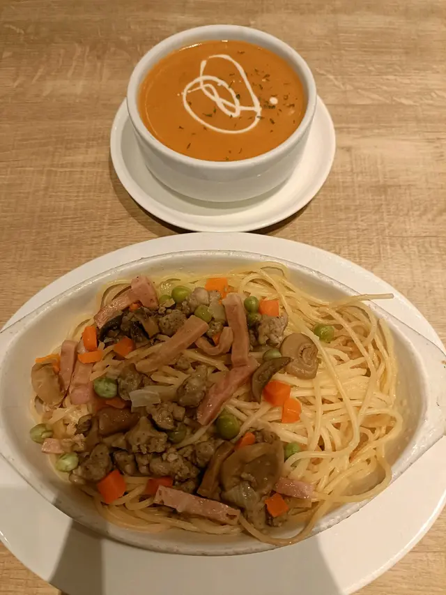 下午茶餐: 香蒜肉絲意粉, 海龍皇湯