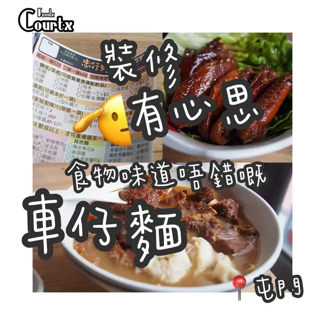 🔲foodxcourtx◾️忠仔麵 foodxcourtx等級32024-05-18479 瀏覽 關注 裝修有心思,食物味道唔錯嘅車仔麵。📍地點:屯門🍽️菜式:車仔麵💰人均消費:午餐 HK$40~60🔖服務費:❎🧻餐巾/ 濕紙巾:❎ / ❎🪑座位類型:方枱/ 長枱📝落單方式:點餐紙落單【4餸車仔麵 - 半筋腩、牛肋條、豬大腸、鮮蝦雲吞】💰HK$55牛肋條必叫,以車仔麵餸來算整高質,材料本身亦較貴。半筋腩、豬大腸可以再食,紋煮得入味,筋腩夠淋。【瑞士汁雞翼】💰HK$32雞皮味道夠瑞士汁,但裡面雞肉完成唔淋身,食落似冷盤醉雞口感。.#foodcourt #foodxcourtx #foodxcourtxTM#屯門搵食地圖 #屯門美食 #屯門 #車仔麵.忠仔麵@mrchungnoodles🏷️ 屯門海皇路23號御海灣地下5-7號舖…查看更多以上食評乃用戶個人意見 , 並不代表OpenRice之觀點。讚好分享🔲foodxcourtx◾️忠仔麵 忠仔麵 (御海灣) https://s.openrice.com/QrbT0cNDJ00檢舉 張貼 評分4味道5環境4服務5衛生5抵食推介美食【4餸車仔麵 - 半筋腩、牛肋條、豬大腸、鮮蝦雲吞】$55【瑞士汁雞翼】$32用餐途徑堂食