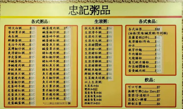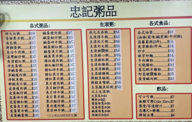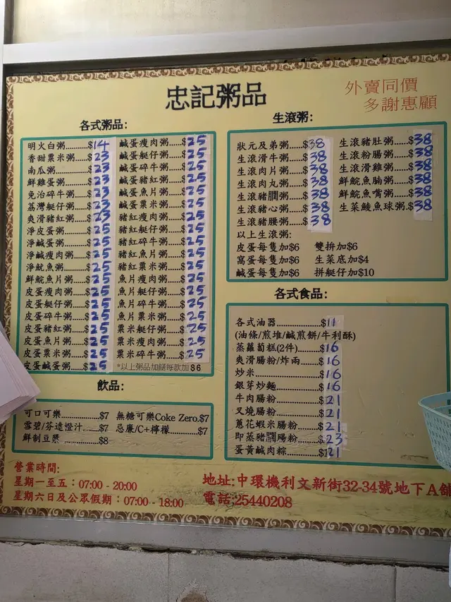 忠記粥品 (機利文新街) (中環) 網址: https://s.openrice.com/QrbS0v7S000 地址: 香港中環機利文新街32-34號A號舖 電話: +852 25440208