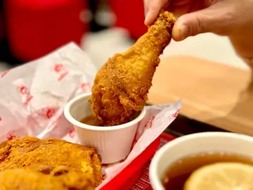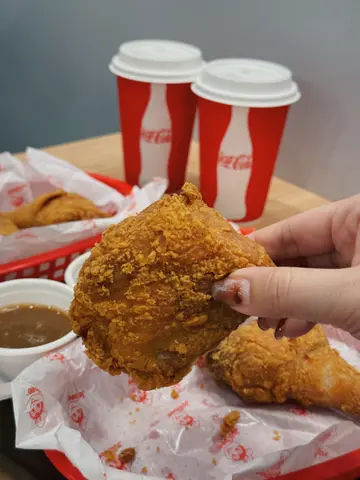 菲律賓國民炸雞店,自從喺香港插旗之後都係姐姐們假日嘅聚腳地之一🫣呢度啲炸雞比起另一間連鎖快餐店的確係大件同埋Juicy好多,試完真係返唔到轉頭🤤 今次要左兩個C2套餐,可以選擇配薯條/薯蓉/白飯/粟米。今次嘢飲升級咗青檸茶梳打+$8,好湖新,配埋炸雞一齊食啱晒!炸雞同埋薯條係啱啱炸起,徒手拎起會有滾燙嘅感覺🙈炸雞配上特製嘅醬汁黎食會冇咁膩,薯條都非常脆身,唔會有軟林林嘅口感。原來佢哋仲有學生優,11am-530pm出示學生證會有九折👍🏻