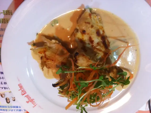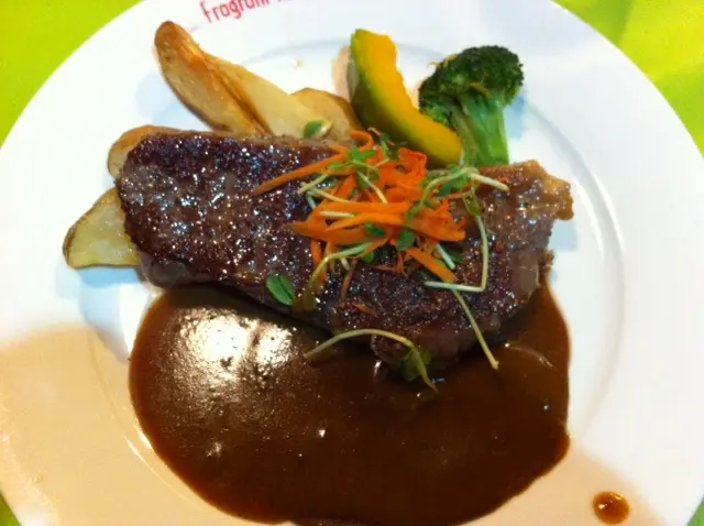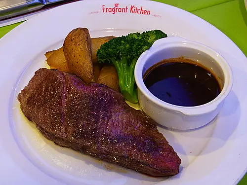 來大角咀的目的除了因為想試試列入wish list許久的《Black n White》,另一個原因當然是為了朝聖…屬於某某的街道!!!哈哈…朝聖過後,由於《Black n White》於公眾假期2pm才營業,那時才1pm左右,只好宣佈計劃擱置,另覓地方祭五臟…二人被《Fragrant Kitchen(意味)》門外的menu「吸引」,因而走了進去…就是這個「巴馬火腿美國自然有骨豬扒配芥末籽汁」,跟他笑了良久,豬當然是「自然有骨」的啦!!!難道世上有些被基因改造過因而沒骨頭支撐身體的豬嗎?!??!我倒是想看看啊…(看了該菜式的英文名稱,完全是因為店子把「Organic」譯作「自然」才引起這個笑料!!!)說回店子,環境不俗!!想不到紫(牆壁)拼青(桌子)還蠻配的啊…主菜連餐飲,均可以「優惠價」多加餐湯(+$5)、沙律(+$10)、甜品等等,且是自行配搭,價錢亦一目了然地於menu內展示出來…先來的是凱撒沙律,蔬菜新鮮,煙肉乾、麵包粒等亦毫不吝惜,絕對交足功課…忌廉湯及餐包則很「豉油西餐」的感覺,一般般…他的「香煎龍利柳伴薯茸配白酒刁草忌廉汁」…(menu內真實名字!!)我的「燒美國牛肩肉扒伴時蔬配青胡椒粒汁」,要了七成熟,想不到原來肉扒是薄薄的,心想「早知就叫五成啦!!」,不過肉質不鬆散,店子以靚牛扒自居的確所言非虛,汁內混有一點點原粒青胡椒,還帶有一點點酸酸的味道,該是下了喼汁又或是檸檬汁之類吧,整體不俗,份量不多不少,對女孩子來說絕對恰好!!!只略嫌醬汁鹹了點。附上咖啡一杯,普普通通…被這個關於「75度心太軟」的介紹吸引了,不好甜品的他罕有地主動說要點來試試…待了好一陣子,心太軟出場了…頗流心澎湃的說!!!嗅起來帶有濃濃的朱古力味,吃起來既不會太苦又不會太甜,就連他亦說「好味喎!!」(須知道他是個不會隨便說任何甜品好吃的人),還跟我「爭食」…總消費$180,食物很讚,服務則一般般,餐具的整潔度亦一般般,餐湯碗外於端來之時已沾有不屬於忌廉湯的「餸汁」,某些碟子還帶有歲月痕跡、沿碟邊分佈了數個缺(崩)口,這是要扣分的地方……查看更多