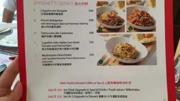 整日反工經過,都係匆匆而過。今日特登與朋友仔下午茶時間過黎試下先。間鋪仔細望落其實唔算大,但因為周圍都係鏡。所以視覺效果下都感覺唔細。而且有兩邊都有落地窗。光線都好好。西餐固定擺盤。下午茶menu.有粉麵、薄餅、三文治與窩夫……價錢都唔算貴。店家仲好貼心咁有埋免費2小時WiFi服務朋友仔叫左一個肉醬意粉,我Order左一個煙肉忌廉汁闊條麵。雖然我地叫既係茶餐,但個份量好似午市咁。兩碟麵食味道與賣相都ok.唯一問題就係麵煮得唔夠淋,所以偏硬。小食:黑椒蜜糖雞翼。無咩黑椒味。但有少少辣椒粉。面頭個蜜糖烤得香脆,唔會太干身,側邊仲有薯仔沙律。整體ok.飲品:雜果賓治。可能得橙汁與西柚,酸酸甜甜。
