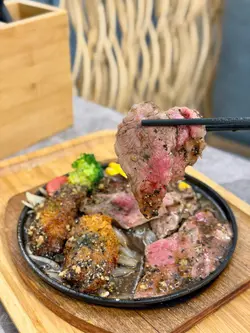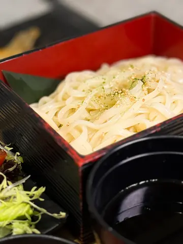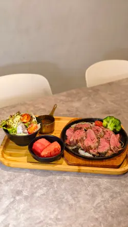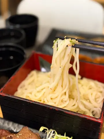 美國牛板腱冷烏冬整份定食本身跟飯,+$10轉烏冬,有溫泉蛋,少許沙律,跟飲品或加錢配小食。牛板腱薄切,份量足,因為連住筋位有趙口之餘又唔會韌,燒到有少許窿邊,少少焦香,掛上醬汁啱啱好。