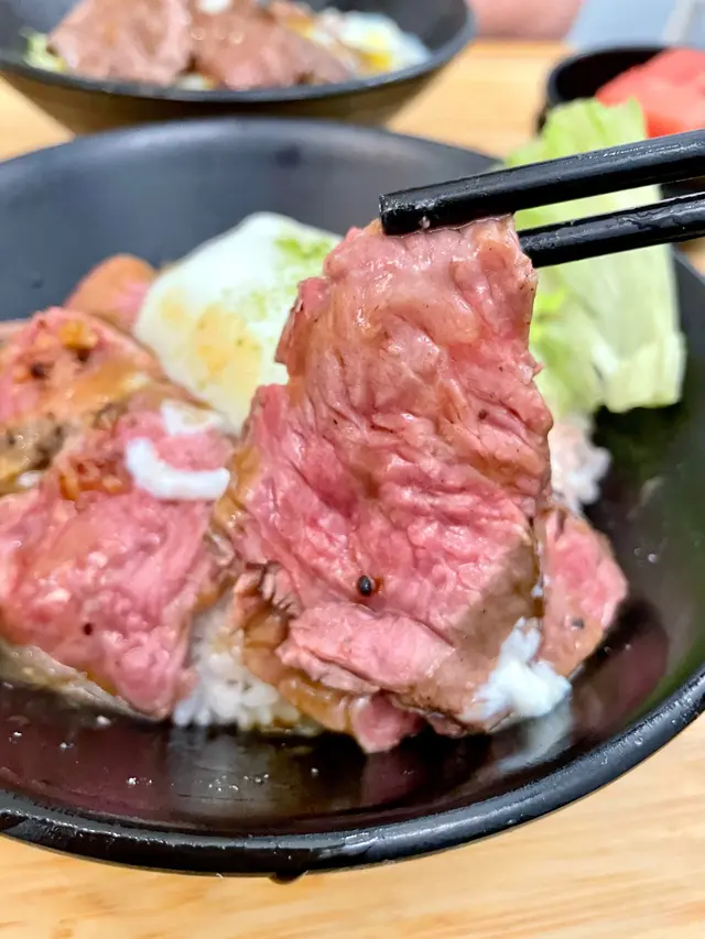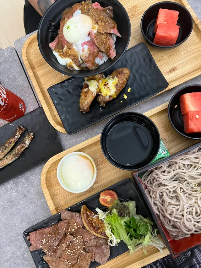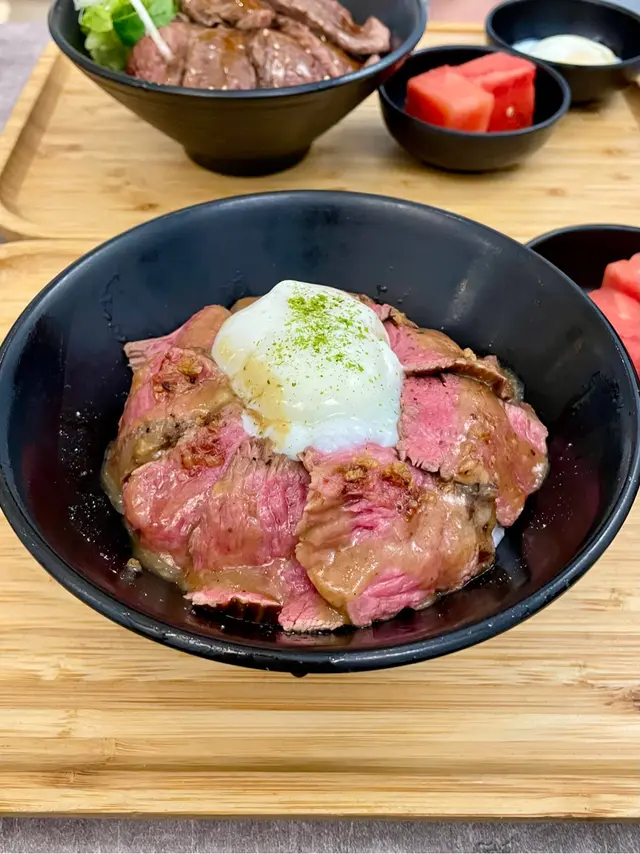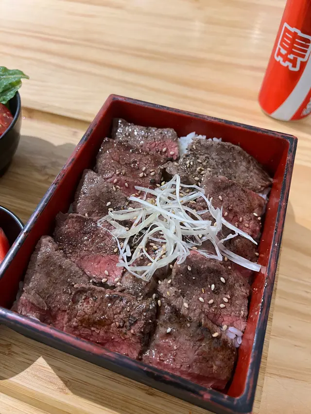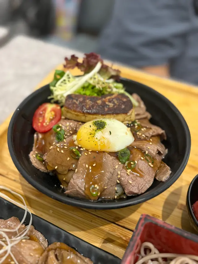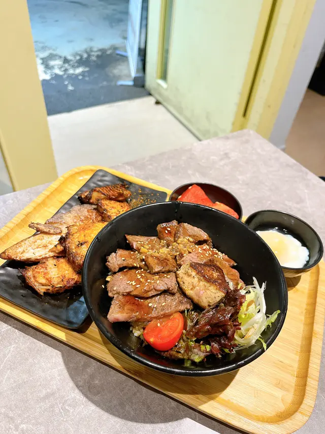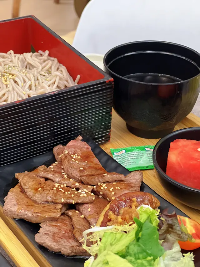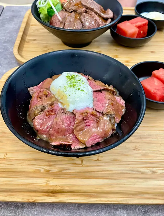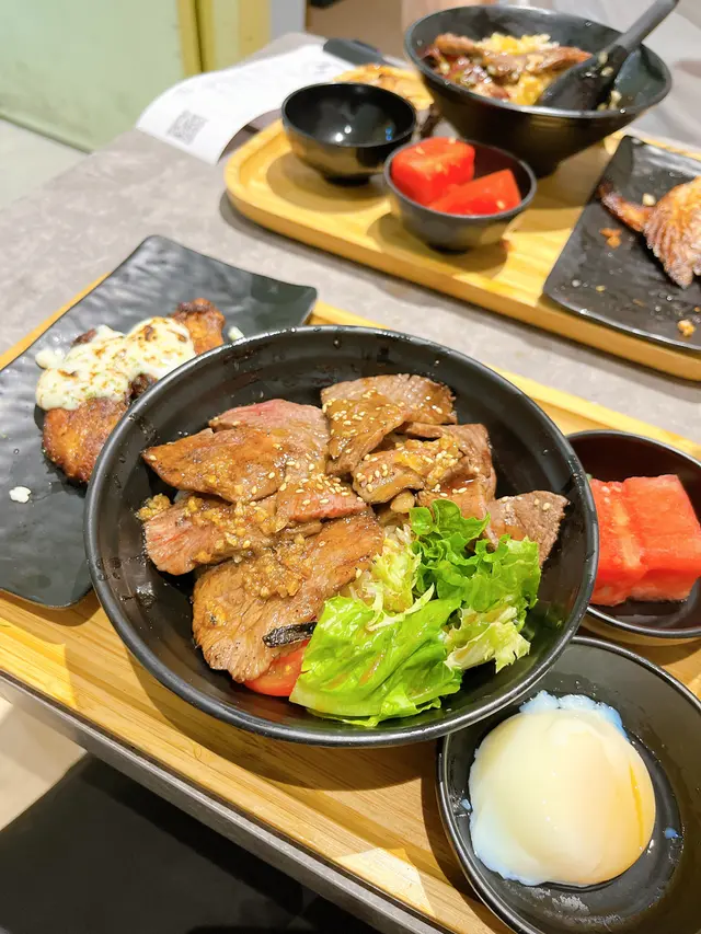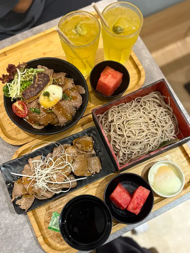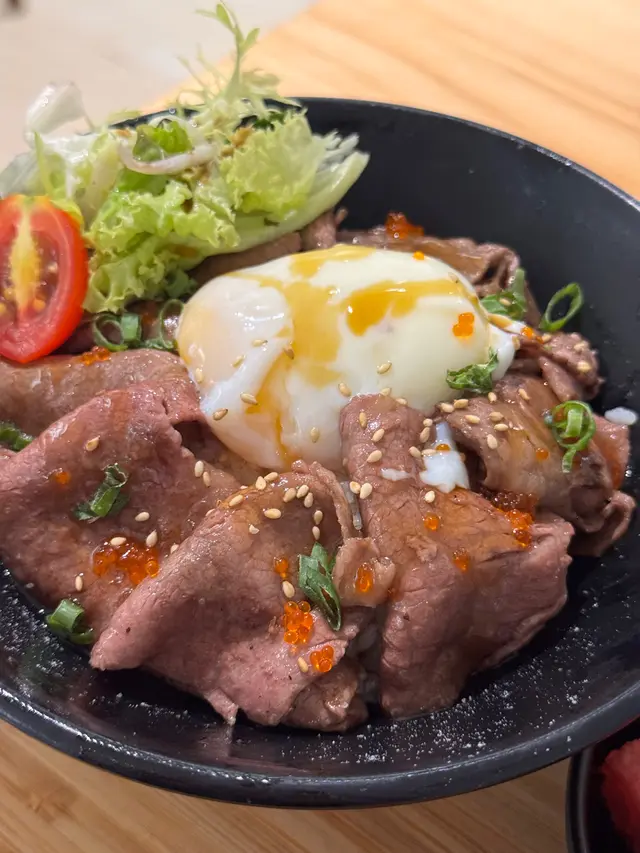 美國牛板腱冷烏冬整份定食本身跟飯,+$10轉烏冬,有溫泉蛋,少許沙律,跟飲品或加錢配小食。牛板腱薄切,份量足,因為連住筋位有趙口之餘又唔會韌,燒到有少許窿邊,少少焦香,掛上醬汁啱啱好。