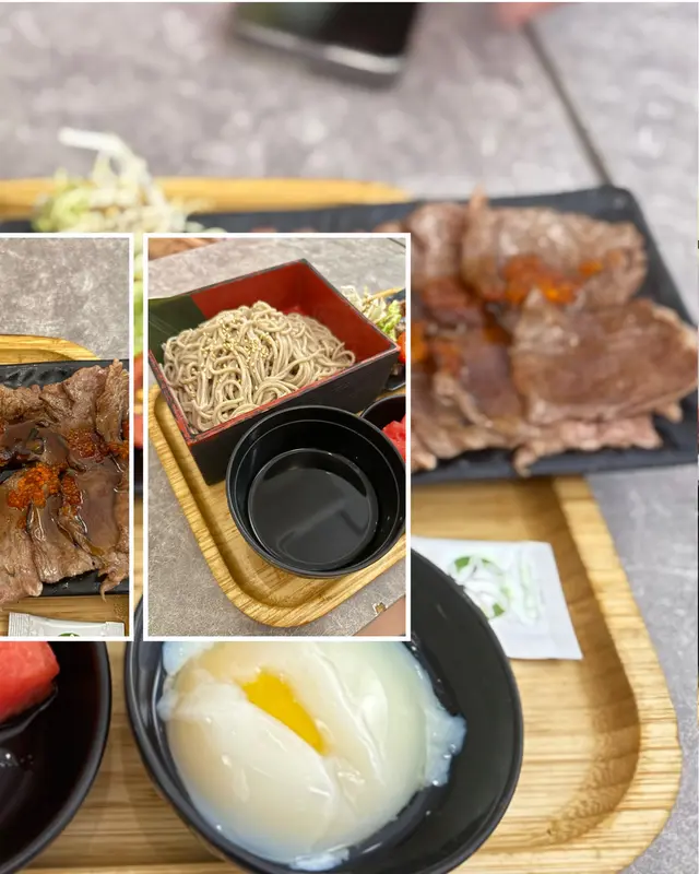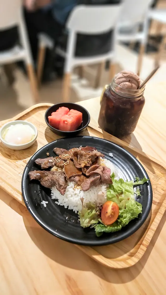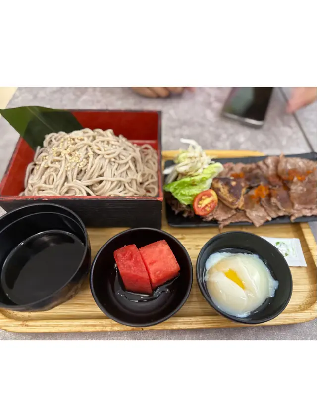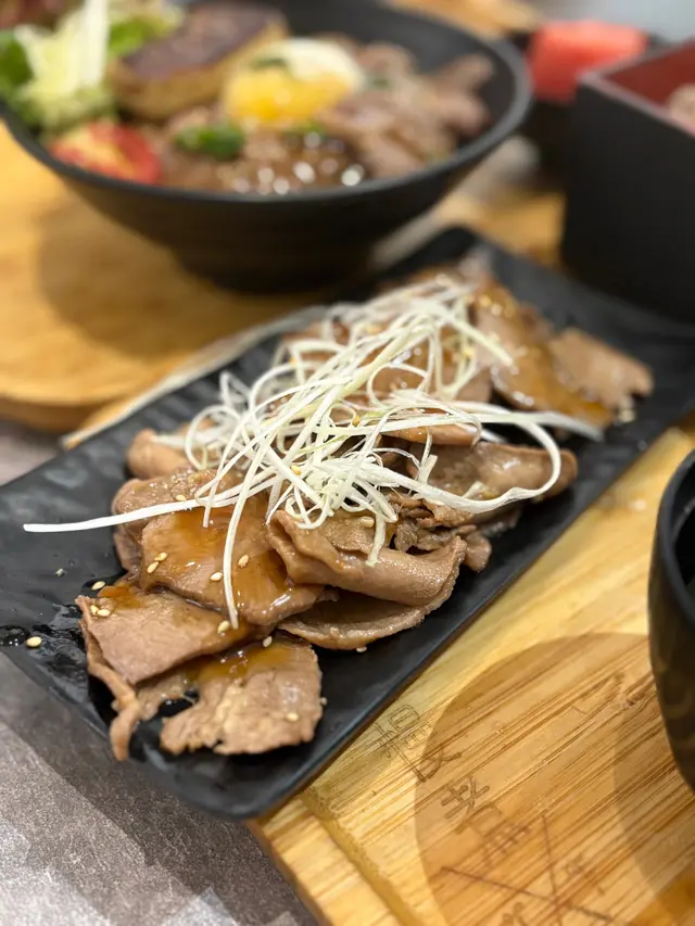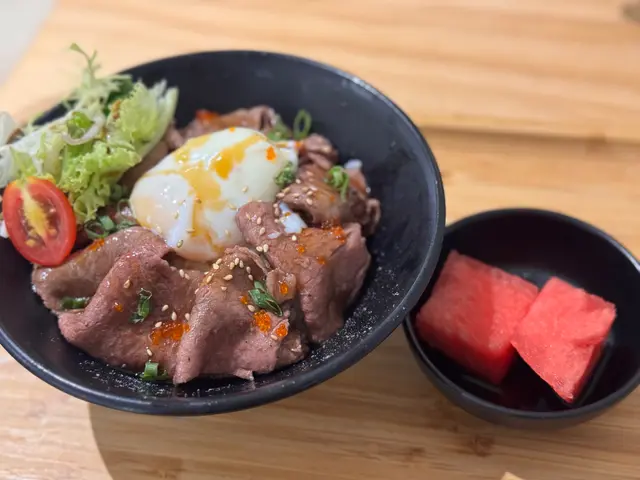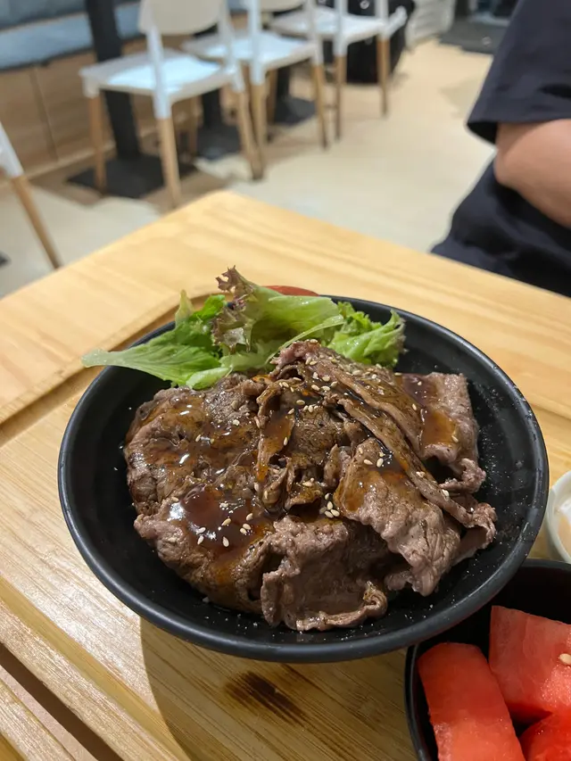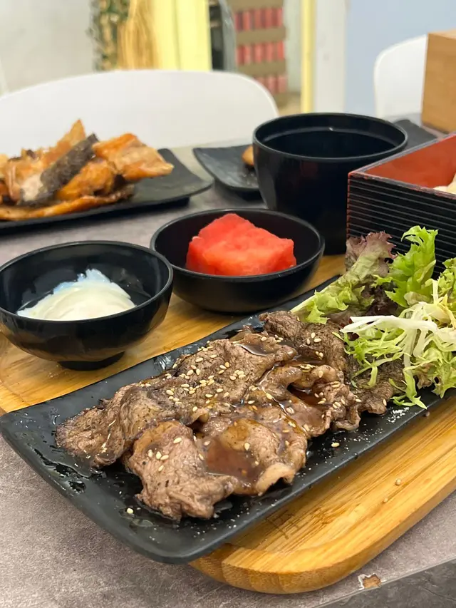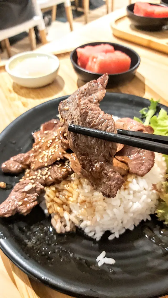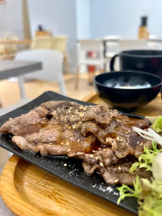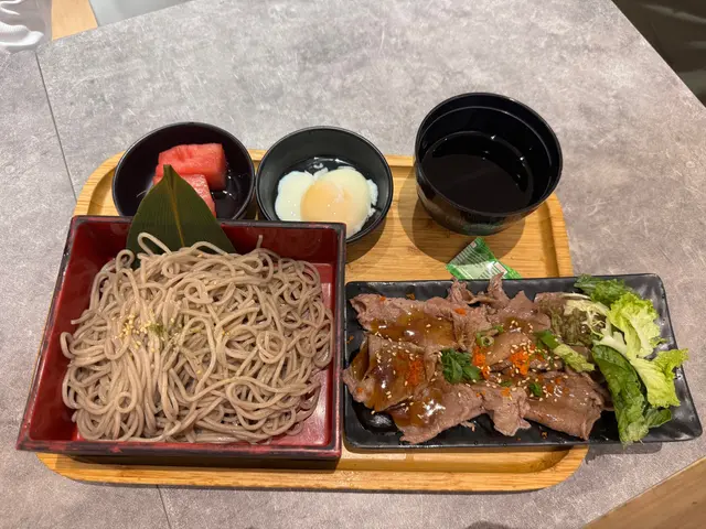 美國牛板腱冷烏冬整份定食本身跟飯,+$10轉烏冬,有溫泉蛋,少許沙律,跟飲品或加錢配小食。牛板腱薄切,份量足,因為連住筋位有趙口之餘又唔會韌,燒到有少許窿邊,少少焦香,掛上醬汁啱啱好。