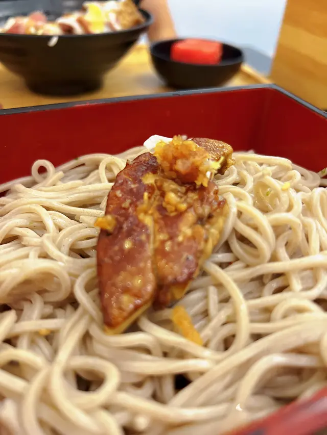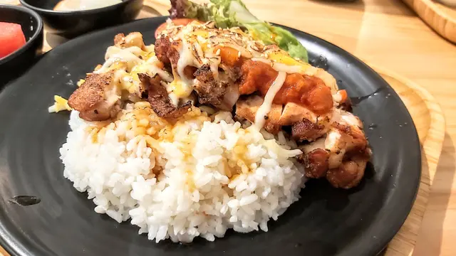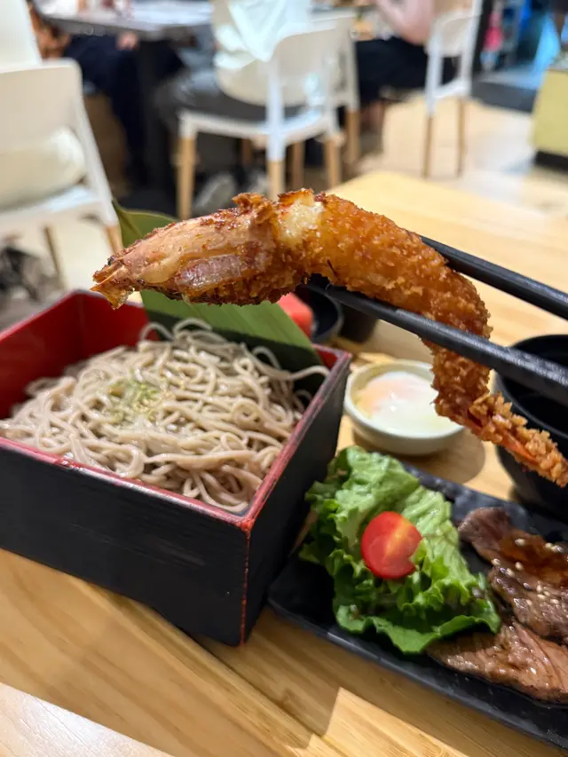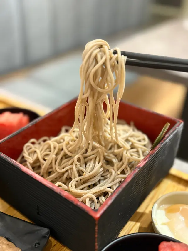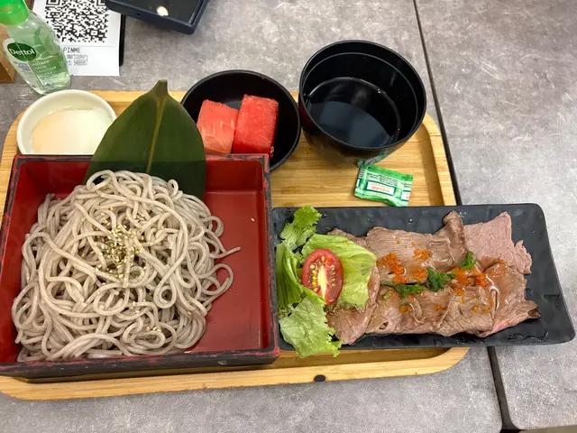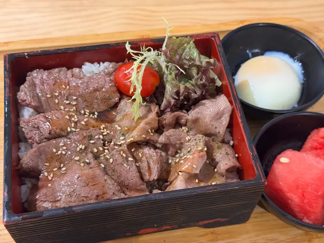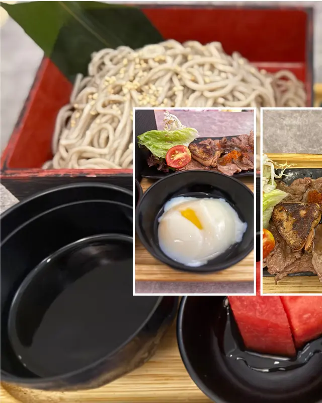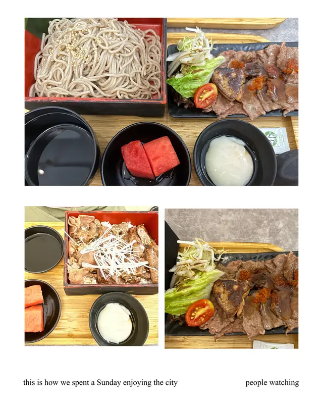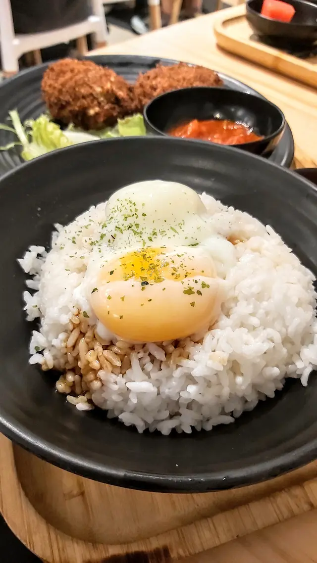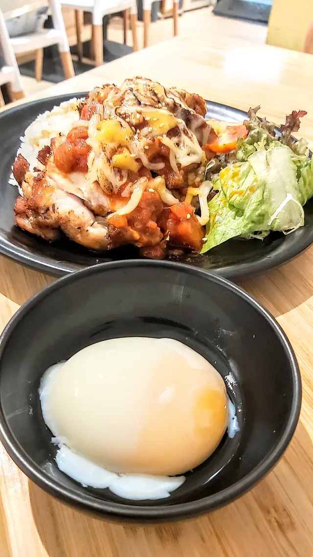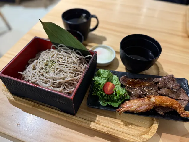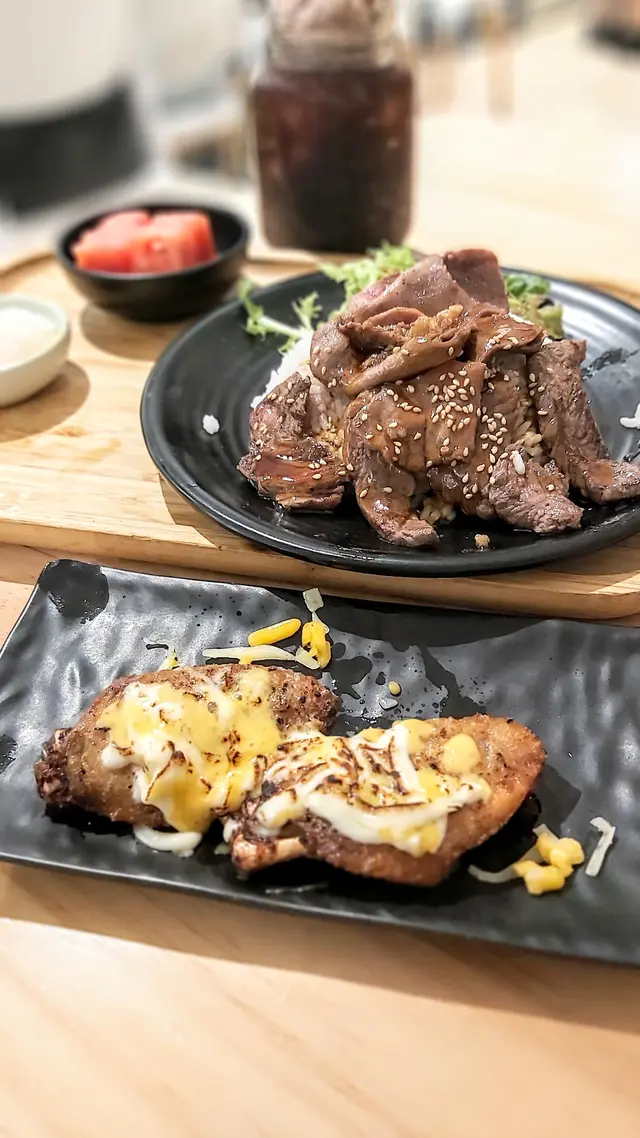 美國牛板腱冷烏冬整份定食本身跟飯,+$10轉烏冬,有溫泉蛋,少許沙律,跟飲品或加錢配小食。牛板腱薄切,份量足,因為連住筋位有趙口之餘又唔會韌,燒到有少許窿邊,少少焦香,掛上醬汁啱啱好。
