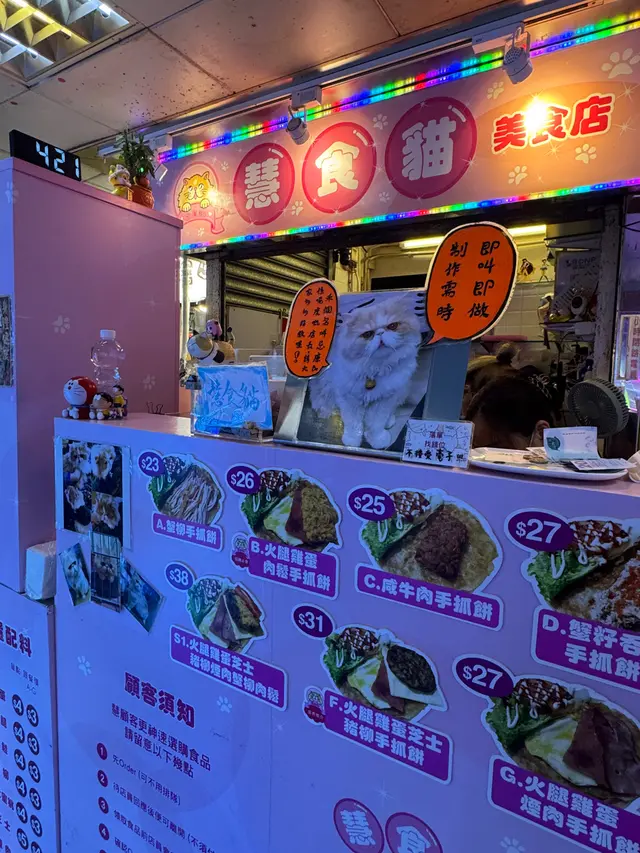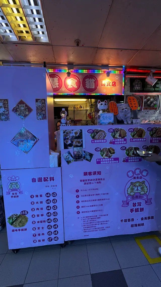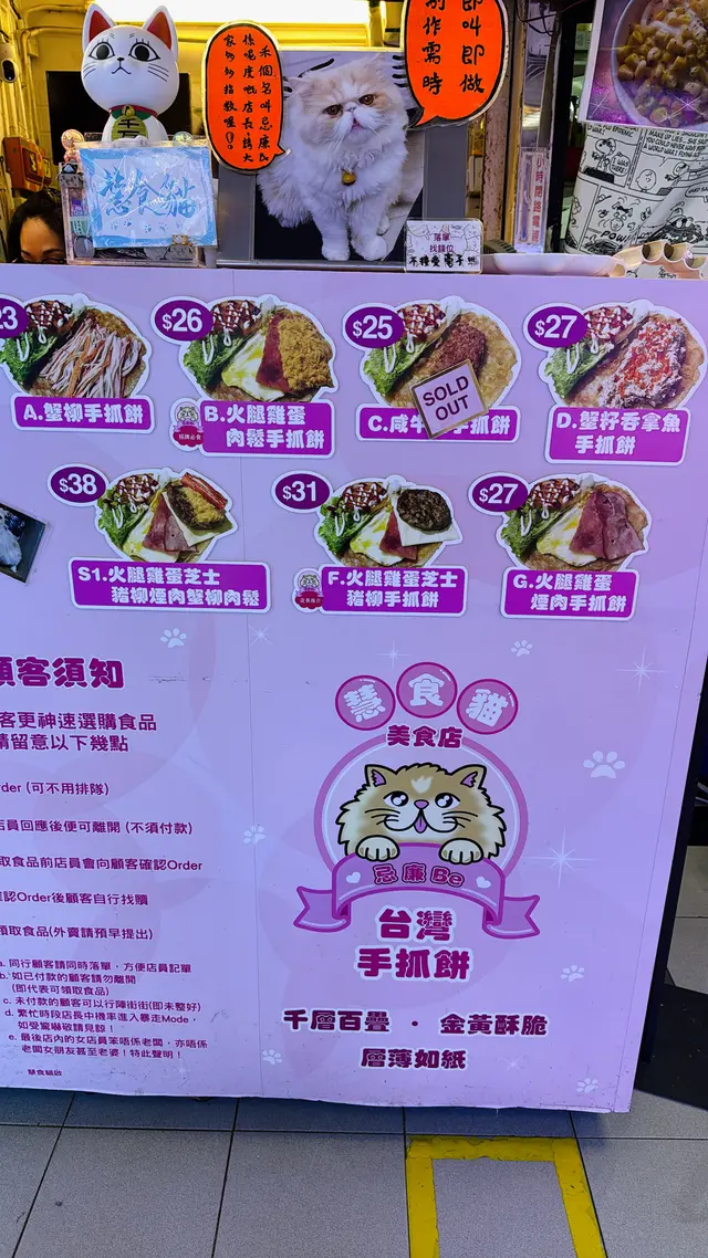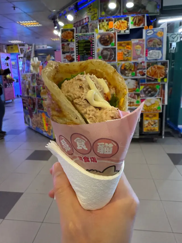 呢間為食貓手抓餅我都幫襯咗好多年其實我喺屋企都係買呢啲台式皮然之後自己加料嘗試去整手抓餅但其他都做唔到佢哋咁好味因為都係即叫即做所以都係熱辣辣好好味唯一唔方便嘅,就係佢唔肯幫你切開一半只係比多個紙袋你自己搣開佢我明白佢如果切既話可能啲餸跌落嚟就會唔靚但我必須講由我哋自己搣開個手抓餅成件事簡直係一個在災難隨時跌晒啲餸喺佢間舖頭面前同埋佢係有好多種可以自己加入去但對於我呢啲有選擇困難症嘅人嚟講佢已經有唔同組合俾我揀會實際啲查看更多