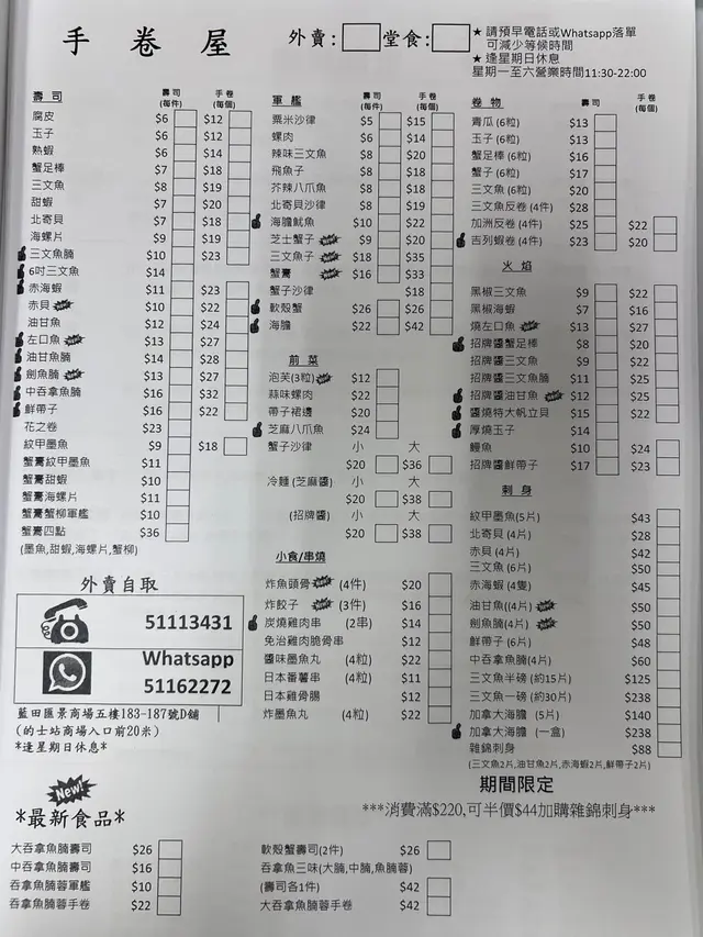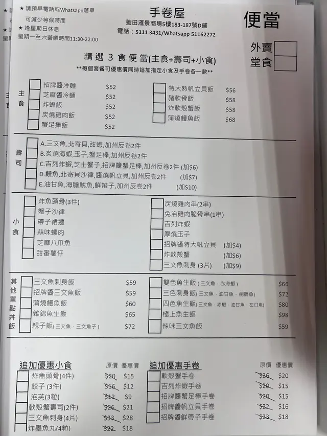 手卷屋 (藍田) 網址: https://s.openrice.com/QrbS0LrG900 地址: 香港藍田匯景道8號滙景廣場5樓183-187D號舖 電話: +852 51113431
