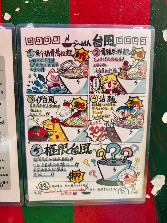 拉麵台風 (荃灣) 網址: https://s.openrice.com/QrbS0bD4100 地址: 香港荃灣大河道81號寶成樓地下7號舖 電話: +852 24197717