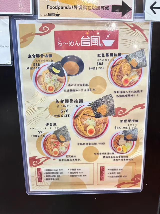 #chuchu食在荃灣📍 拉麵台風荃灣the best拉麵🍜 住呢頭無人唔識,原來都食左成12年,真日本師傅駐場,搬咗過幾個舖位坐得舒服咗,多咗好多位,但門口都係繼續排長龍!不過快咗好多,今次排咗15分鐘左右only ! 老闆好鍾意日本動漫,全部都係Figure,如果同好一定好happy😏💡真係好旺的,要預時間排一陣—————————————————————❣️ 魚介豚骨拉麵 $78✨追加咗個半熟蛋(+$18)湯底超!濃!有魚介粉係面頭,超級鮮香同豚骨湯底好濃,一定要先飲啖湯🍜 叉燒半肥瘦啱啱好,入口即融!追加半熟蛋係必須吧,溏心蛋黃撈埋湯一齊食!.❣️ 伊台風 $98都追加咗個半熟蛋(+$18)#chuchu推介 次次都係叫呢個食咗起碼10年!呢個係蕃茄湯底,最特別叉燒上面係有芝士🧀仲要係炙燒過,可以拉到絲,超級香!芝士同蕃茄味好夾好出,同埋啲拉麵好彈牙,軟硬適中!✨只係叫咗100g,所以可以轉其他配料,今次轉咗紫菜.❣️ 烏龍茶 $12食完濃湯拉麵啜返杯冰涼烏龍茶,爽啊~🍵 解膩一流!.💬 出咗家台風,係屋企都可以食到😋—————————————————————不專業評分👅好味指數: 9/10 💰性價比: 8.5/10👍🏻推薦: 9/10 —————————————————————🏡地址: 拉麵台風 (荃灣)地址: 香港荃灣大河道85號寶成樓地下9號舖👉🏻旺角灣仔日本東京🇯🇵都有分店!🕑營業時間: 12:00 -22:00————————————————————— #chuchu食日本野 #chuchu食拉麵—————————————————————Follow🐷 @chuchu_hkfoodietag埋你啲朋友仔like下我啲po♥️需要你的支持喔🥺🙆🏻♀🐷💬每一篇食評都好認真打架…查看更多
