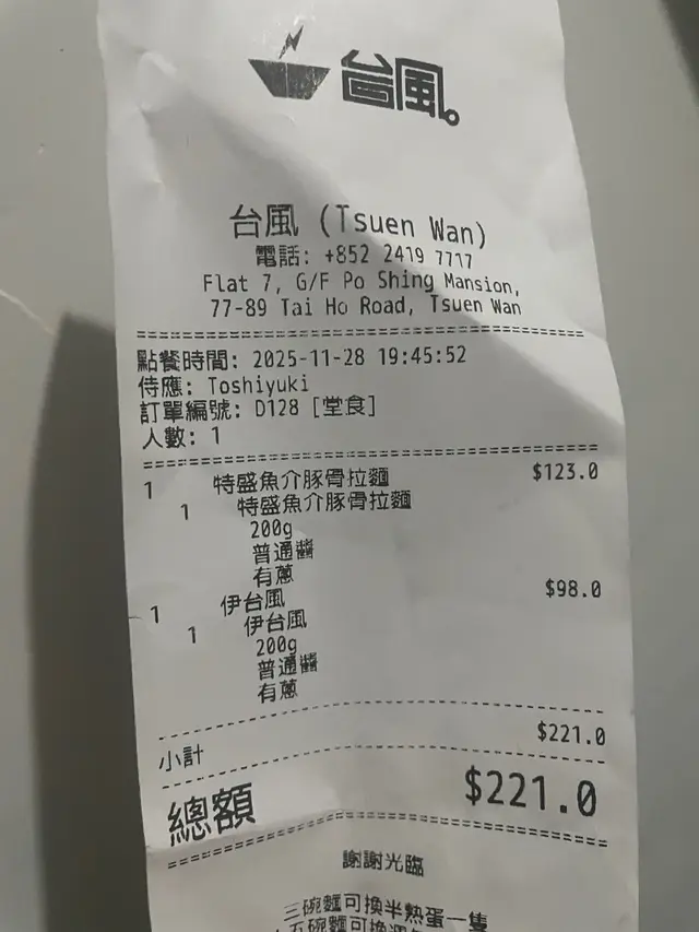 拉麵台風 (荃灣) 網址: https://s.openrice.com/QrbS0lLmD00 地址: 香港荃灣大河道85號寶成樓地下9號舖 電話: +852 24197717