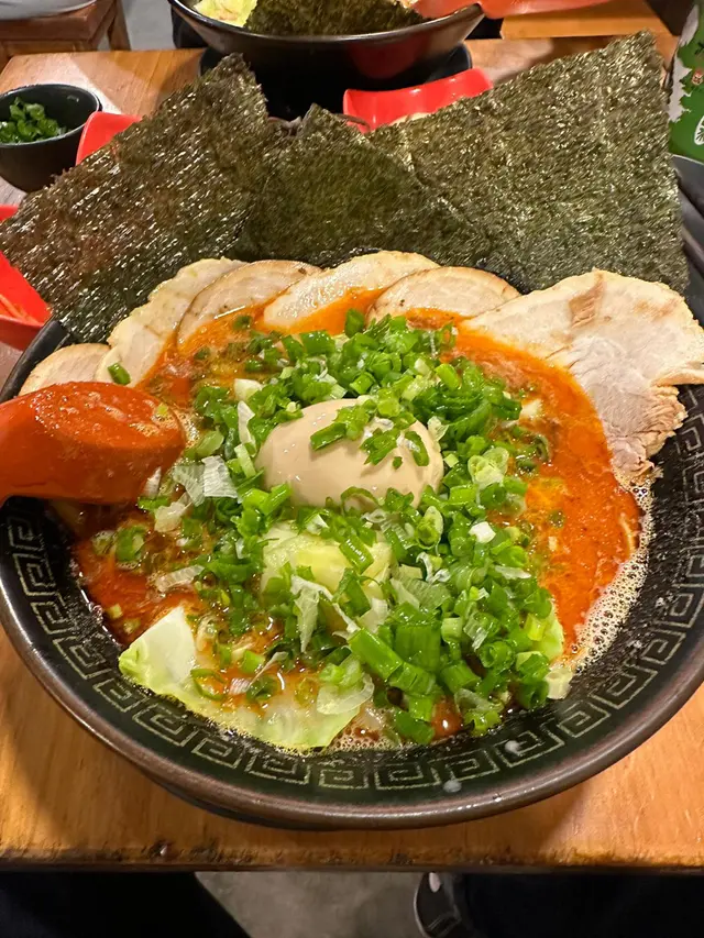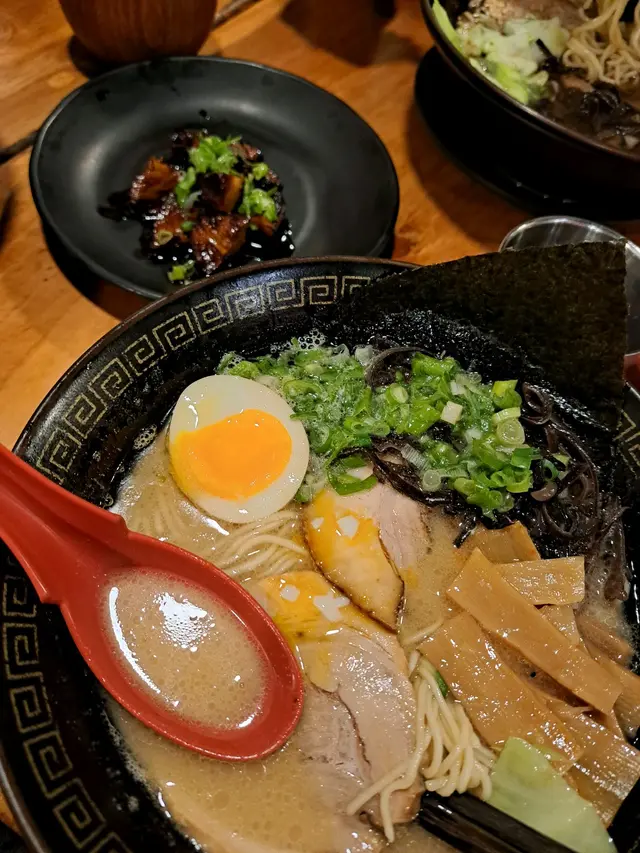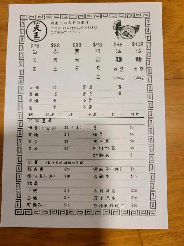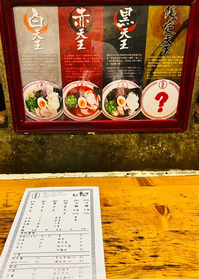 說自己是拉麵界的天王, 相當大口氣. 這家良心拉麵店在紅磡舊區, 距離HKCC並不遠, 作為Late Dinner它的質素不錯, 當然香港拉麵店的普遍問題, 就是定價真的有點貴, 特別是當日圓貶值的時候. 這裏提供的拉麵選擇相對簡單, 就是豬骨, 辛辣, 黑蒜和當日限定. 喜歡嘗鮮的我, 自然就選擇了當日限定, 也就是黑椒芝士拉麵.麵身偏幼, 口感夠爽夠硬, 湯底是豬骨湯加上胡椒和芝士, 並不死鹹, 胡椒微辛, 芝士也提供額外的鹹香, 融化後湯底質感更濃稠. 叉燒肥瘦分明, 烤過之後的焦香與胡椒香味頗夾. 有皮脂肉三層的叉燒不是很多拉麵店會做, 現在已有不少的以慢煮為主, 能吃到如此原本的味道, 算是難能可貴.Tenno Ramen mean the king of ramen. The owner and chef has strong confident on the quality. The type of ramen is simple, original, spicy, black garlic and daily special. I have order the daily special that is cheese pepper flavour. The taste and texture is not bad and deserve have a try.…查看更多