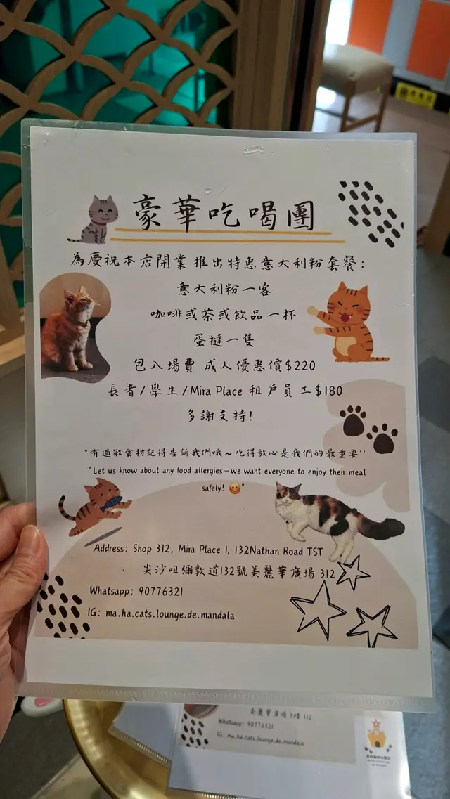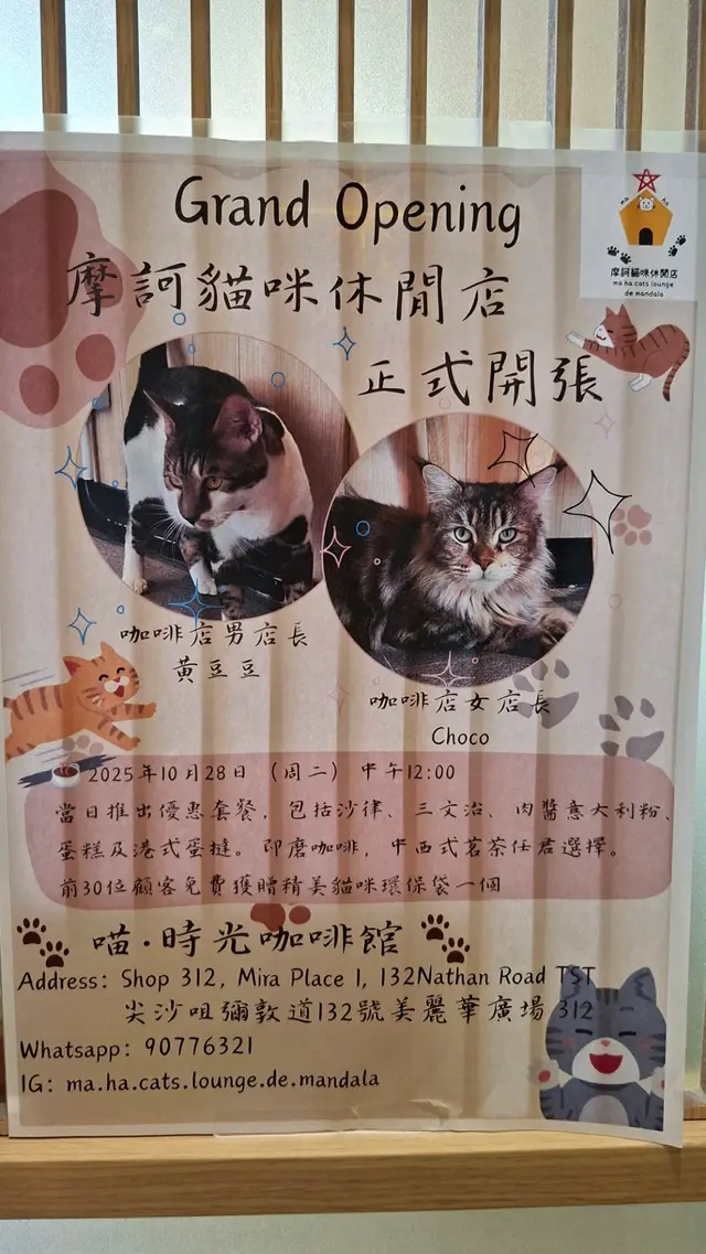 摩訶貓咪休閒店 (尖沙咀) 網址: https://s.openrice.com/QrbS05QSF00~dpi8Lfdr2 地址: 香港尖沙咀彌敦道132號美麗華廣場一期3樓312號舖 電話: +852 90776321