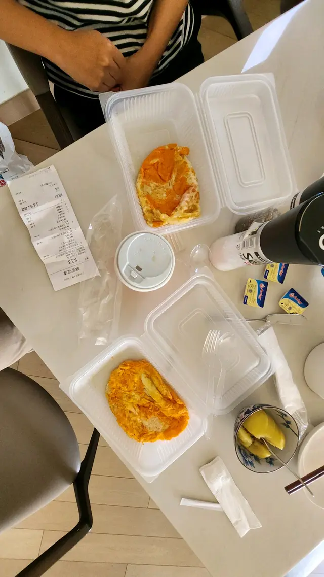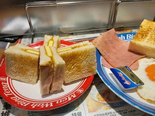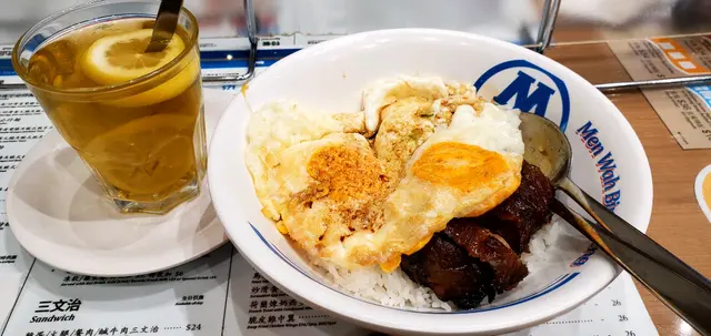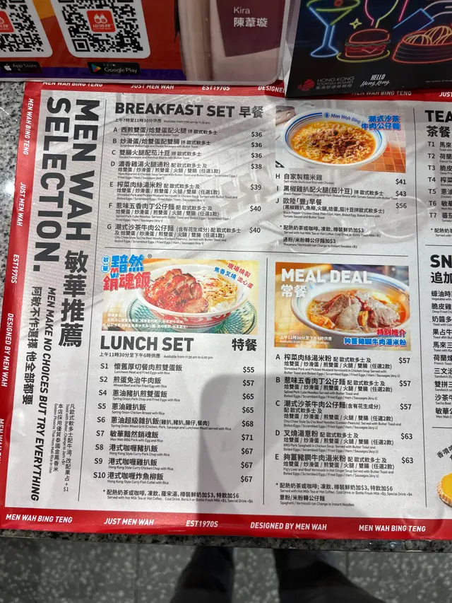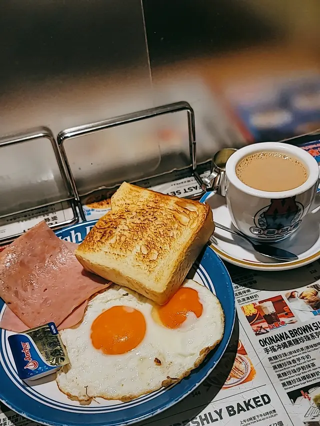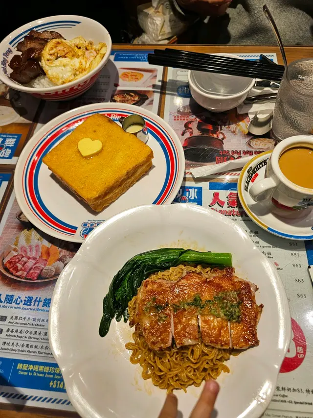 馬來三叔公咖央多士$33,啡走$3、 潮式沙茶牛肉公仔麵$57, 煎雙蛋 火腿, 歐式軟多士,凍奶茶$3