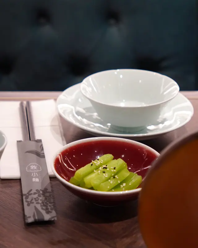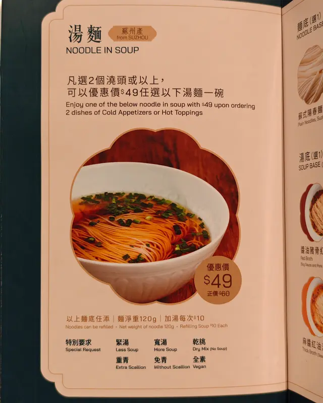今日真漢子為大家介紹位於尖沙咀 K11 購物藝術館嘅敍 . 小麵,為香港首間蘇州麵店。開得响 K11 以為好貴啦,唔係喎,價錢係非常親民。🫰🏻餐牌上嘅素食選擇出奇地多,真漢子當然盡試啦,今次叫咗:🍜 蘇式湯麵(配兩款或以上澆頭優惠價)雖然呢度仲有一款素麵係「素雜錦煨麵」$60,但蘇式湯麵係呢度招牌菜,當然要試啦(注意麵係蛋麵)。湯麵原價要 $60,配兩款以上澆頭特價 $49。😃澆頭即係陽春麵上嘅配料,有冷亦有熱澆頭,咁啱都有素嘅選擇喎。我揀咗一冷一熱配搭,麻香拌萵筍$19 同紅炆大素雞 $39。🥬🐥麵條仲可以揀「蘇式陽春麵」或「姑蘇闊條麵」,我就揀咗加菲貓都鍾意食嘅闊條麵。湯底本身係豬骨湯或雞湯,落單時可選全素嘅菇湯。🍄個麵嚟到時,見到其實係比一般上海麵粗少少,麵質都算靚,有啲咬口,而且麵嘅份量夠多。湯底初初食比較清淡,但起碼放心冇比錯肉湯,而且慢慢食開始食出菇湯嘅鮮味,因為唔咸又唔油,所以可以放心暢飲。👅麻香拌萵筍望落細細碟,但都幾襟食。萵筍非常爽脆,有淡淡嘅麻油香味,表面仲加咗少少黑白芝麻。素雞好少食到好食嘅,呢個紅炆大素雞就超哂班。一咬落去,竟然係煎到表面好香脆,而且用醬油同蔥炆到好入味好鮮甜,除咗配麵,相信配白飯都好正。😋🫖 凍荔枝紅茶 $42呢個茶真係境界好高,此話怎講呢?一般荔枝茶一定有多少甜味,先令你飲出荔枝味。但呢個茶,端到埋個鼻度未飲都已經勁香荔枝味,但飲落去好似全冇甜味咁,但你又飲到佢濃濃嘅荔枝味 + 茶味。好好飲呀,究竟係點做到㗎?😂 ⚪ 蘇式素菜包 $32有兩個,個包又係好好食,非常鬆軟,味道亦好好。真漢子唔知正宗蘇州菜係點,但感覺都係類似上海嘢。我幾鍾意呢度環境幾靚又坐得舒服,同埋價錢確係抵食。下次經過尖沙咀不妨嚟試吓。☺️…查看更多