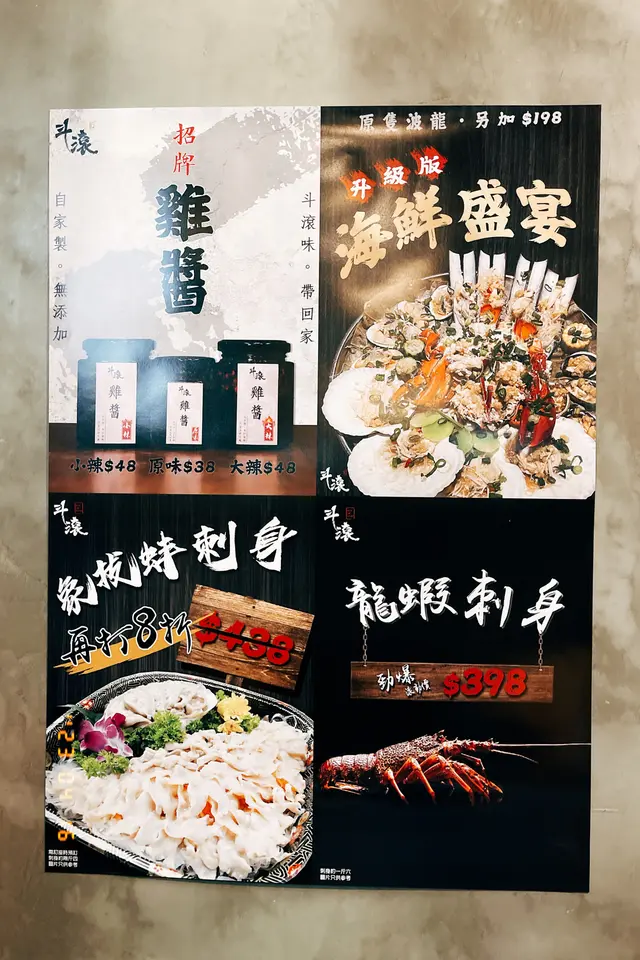 枱與枱之間擺放得好密集,環境狹迫。斗滾的雞煲及火鍋都是任食,海鮮則是限量的,每位$298,另收加一。亦可加錢加購海鮮或提前預訂龍蝦刺身/象拔蚌刺身。先上雞煲,雞煲可選不辣,辣度也有四種。斗滾的雞煲特別在於自己也有份煮!每隔兩分鐘就揭開煲蓋炒一炒,一共炒四次即可。當炒到第三四次之後,配料的味道開始飄出,雞煲變得香噴噴。雞件啖啖肉又嫩滑入味,豆卜及菇菌也有不少,而且是任食的,不夠喉的話,可再添加~~食完雞煲就輪到海鮮盛宴,一共有6款海鮮,份量按人頭數。海鮮有鮑魚、蟶子、扇貝、海蝦、花蜆及龍躉,還有少量蔬菜及讚岐烏冬。每款海鮮都好鮮甜,蒜蓉香惹味,但不會遮蓋海鮮的甜。海鮮的熟度恰好,爽口不會過韌,魚片嫩滑。火鍋湯底的選擇不算多,我們選了養生燉湯,即蟲草花烏雞湯。食火鍋前先飲湯,湯底足料清甜!任食手切牛頸脊,需要全枱在社交平台留言才可享任食優惠,除牛頸脊外,還有黑豚肉也是任食。值得一讚的是,每一round牛頸脊的質素都是同樣好吃,不會有參差的情況。牛頸脊的肉味香濃,入口稔滑無筋,好吃!丸類及蔬菜有充足選擇,需要去雪櫃自取,丸類質素正常。烏冬更是原個包裝的讚岐烏冬,$298的價錢絕對令人吃得飽飽的離座!最後還有每人一碗椰汁雪燕,椰汁味香,不會過甜,雪燕軟滑!以這樣的價錢,食物份量及質素是值得的。惟空間環境問題是最大弊病,狹迫不在話下,空氣亦不夠流通!