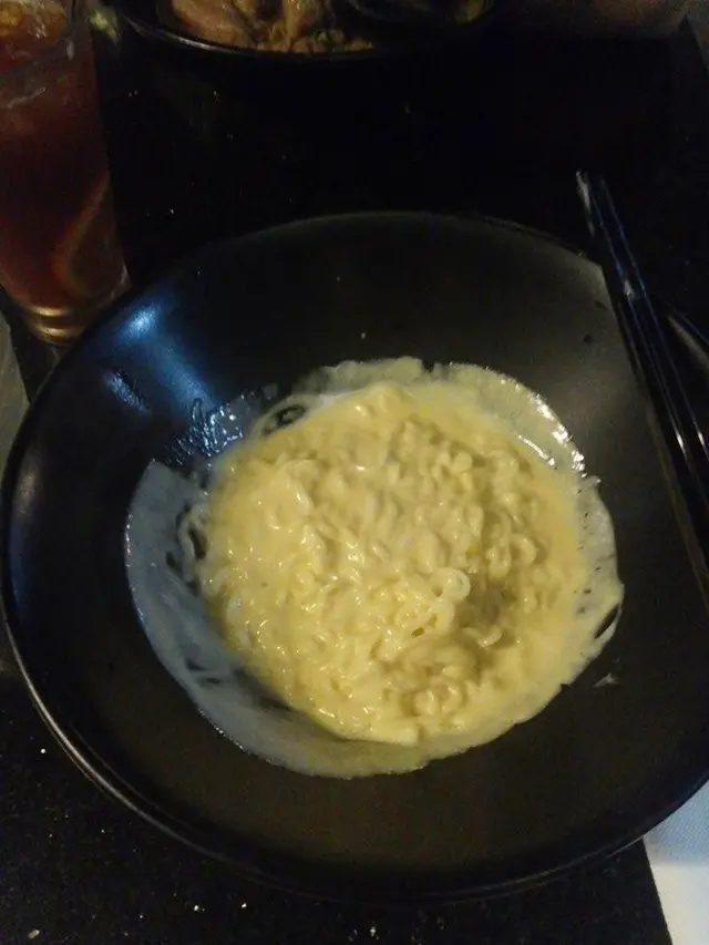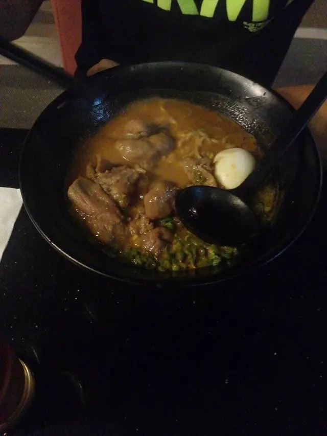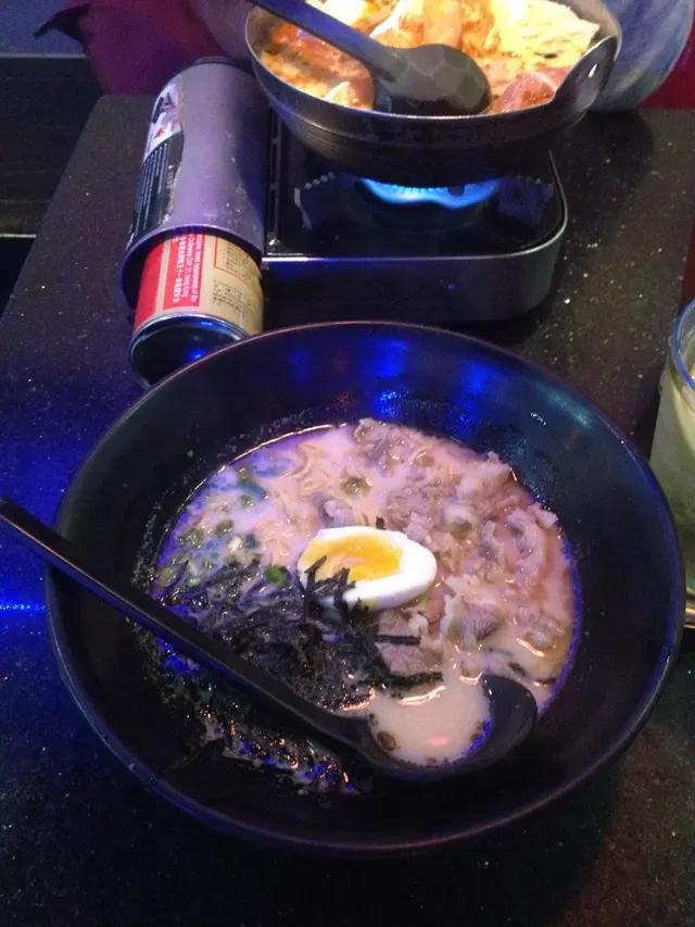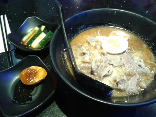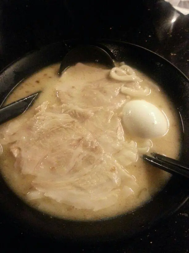事緣走入這間專門賣日本拉麵的店舖,而一眾侍應都是 MK Look 的青年,雖然燈光比較黑暗些,OK我當佢係慳電囉…MK檔style囉。點了其「第一主打」的黑蒜油豬骨湯底燒雞扒拉麵,約五分鐘後拉麵和配餐奶茶先到。燒雞扒呢?未到。咁唯有打住手機等啦!過了幾關candy crush都未見燒雞扒蹤影,我問了侍應,雖然知道他很忙,怱怱地講:「…等等…等等…」然後又走o左去,又等了十分鐘,才把雞扒上桌。如果我沒有堅持等埋雞扒,在這十幾分鐘我慢慢食都食晒碗拉麵了。先講雞扒,以為佢要我等十多分鐘,就應該熱熱的上桌。NO 囉 :( !只有微暖,而且入口非常乾身,差不多像印度燒烤或非洲雞texture. 這個不是我expect的配搭日本拉麵的燒雞扒!再講拉麵。先講端上來時的拉麵,的確有一陣黑蒜油的香味,而青葱的份量亦適中。可是,當等埋雞扒才食拉麵的話,這些油在湯面凝成一層薄膜,很難看!味道方面,豬骨湯底略為淡,如果沒有黑蒜油的話,吃下去的麵候會是毫無味道。這次飲食經驗最大發現的問題,是上菜的時間要夾得準,做好的食材才會發揮其最美味的優點。如果他們先燒好雞扒時才煮拉麵,或知道雞扒差不多做好才煮拉麵,效果會好好多。不過這班MK青年究竟明唔明怎樣做飲食生意呢?