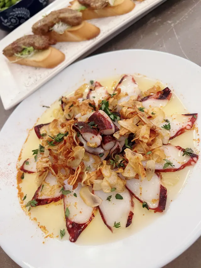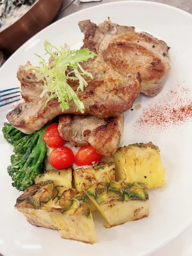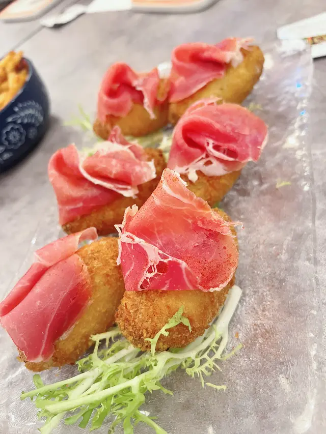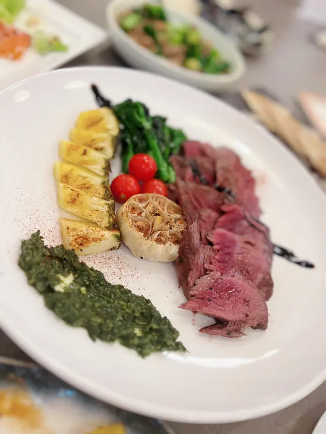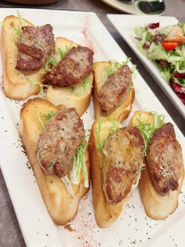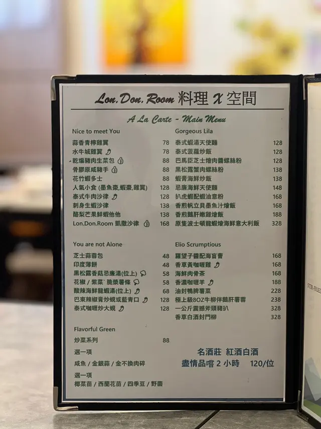 鵝肝多士,風腿雞卷,忌廉汁煮青口,蝦沙律,煙三文魚凱撒沙律,欖油蒜片蝦,西班牙八爪魚,斧頭猪扒,紅酒燴羊膝,慢煮封門柳,炒椰菜苗