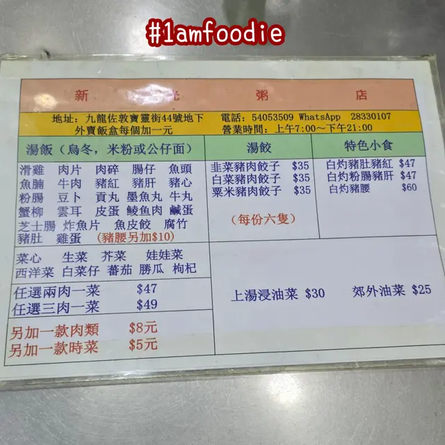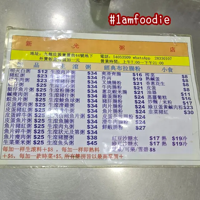 新光粥店 (佐敦) 網址: https://s.openrice.com/QrbS0eYGB00 地址: 香港佐敦寶靈街44號地舖 電話: +852 54053509