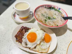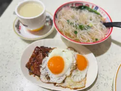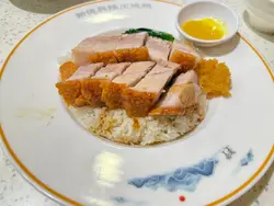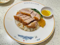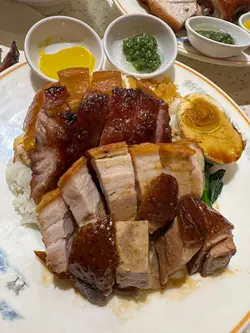 南下來公幹嘅同事想食正宗港式燒味,於是去咗上環「新德興」。最好不過系5寶,我哋叫咗招牌燒鵝同乳豬五寶飯。燒鵝皮脆肉嫩,帶陳皮清香,汁撈飯真係一流;乳豬皮脆而不膩,油脂香恰到好處。同事話內地燒味偏甜軟身,呢度嘅明顯更香脆濃郁。燻蹄例牌切得薄身,爽口入味,點蒜蓉醋汁非常開胃,正好平衡燒味嘅濃郁。蜜汁叉燒米粉嘅半肥瘦叉燒淋上蜜汁,味道香甜,米粉份量足夠,食落飽足。整體而言,同事大讚新德興嘅燒味火候同調味出色,尤其脆皮同蜜汁嘅平衡做得好好。呢度每碟份量都超級大,真係相當抵食!如果想體驗傳統港式燒味,「新德興」確實係好選擇。