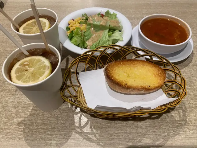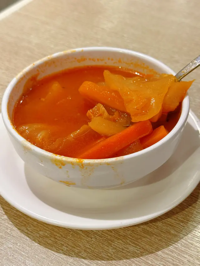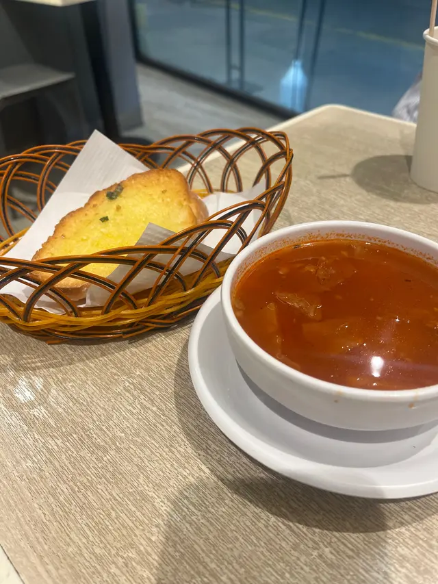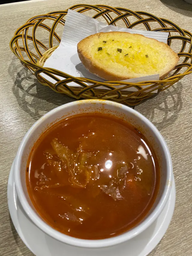 羅宋湯非常足料,有好多蔬菜及洋蔥,酸酸的頗開胃!牛油蒜蓉多士脆卜卜,配湯一流