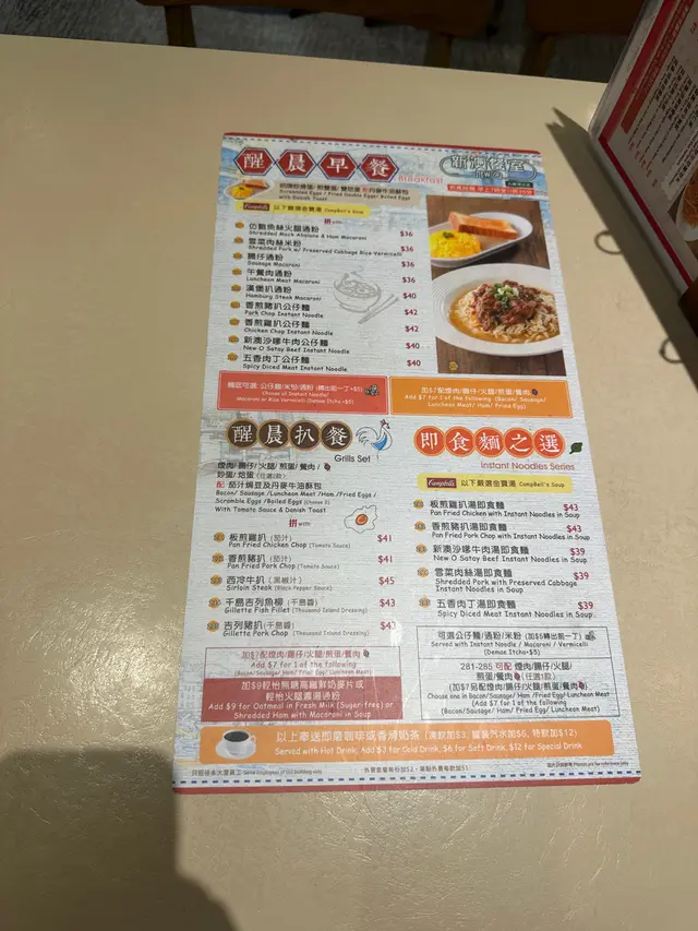 夜晚冇得揀 入黎諗住穩穩陣陣叫個常餐55蚊香煎豬扒米粉 配丹麥酥 炒蛋 熱奶茶平平地本身都唔預佢有幾好食點知一個咁基本既常餐都可以整到咁差成個餐我將佢分為3 part- (主食)香煎豬扒米粉- (配菜)丹麥酥 炒蛋- (飲品)熱奶茶 負評之前都講番少少公道說話先配菜同飲品都叫做正常茶記水平冇咩特別 不過未至於話好難食重點黎啦 碗面真係世界級塊豬扒 凍既 就咁浸落個面到個米粉 硬既 似未煮過就咁拎出黎 雖則話賺你幾廿蚊唔好有咁高要求大佬丫 食到哽胃 我仲要嘥錢去睇醫生嬲到我要打番200字黎留呢個負評…查看更多
