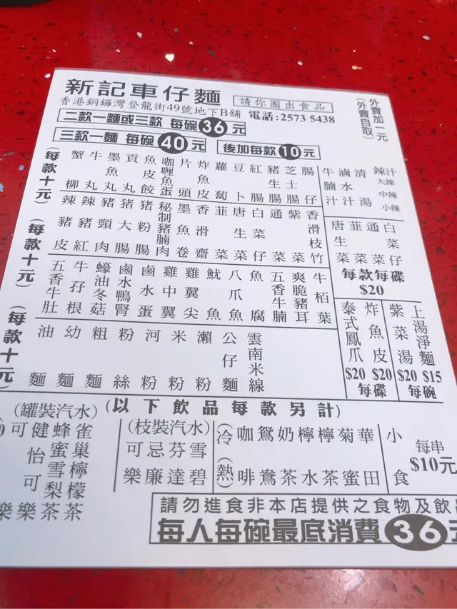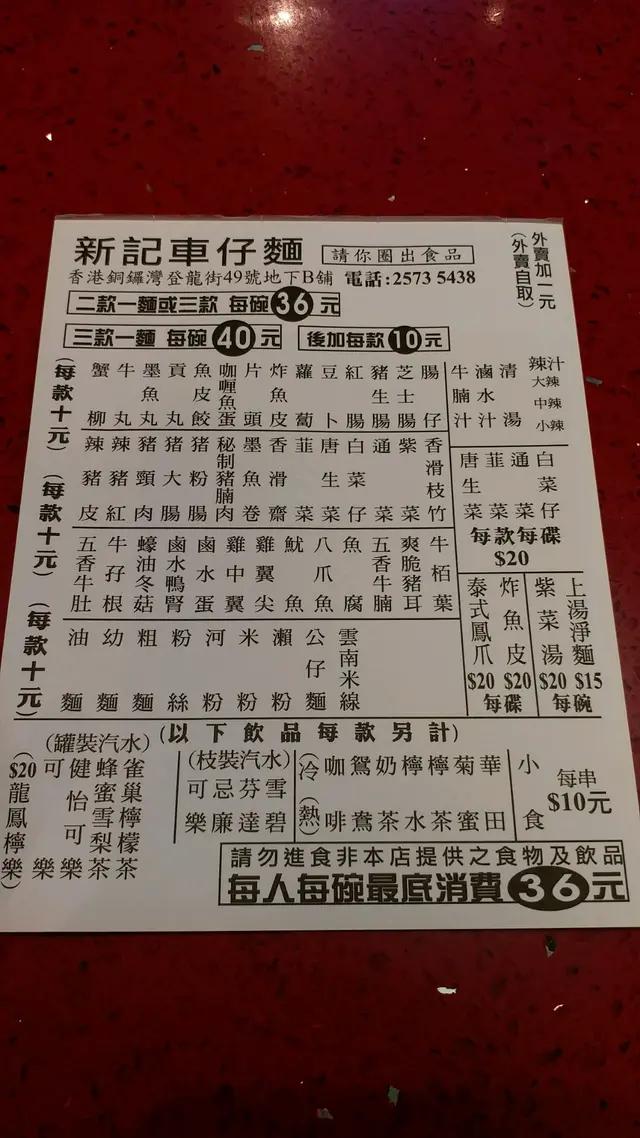 今天晚上2020年6月16日19:30左右,在銅鑼灣登龍街49號B舖地下新記車仔麵,我和女兒各叫了一碗車仔麵,我叫3款餸,淨餸,嗰女侍應寫得不大清楚,似30又似36,我問過女侍應,佢話3款餸30元,咁我不以為意,我大女叫了65元一碗車仔麵,後來我地食完後再加2款餸唐生菜和魚蛋20元,個侍應寫在貴的單上,後又再加牛孖筋10元,又是寫在貴的單上(65+20+10=95),埋單時本來就是30+95=125,怎知侍應生話有最低消費,30元嗰張單最少要收36元最低消費,如果是這樣的話,為何我加2次餸,妳不寫在30元的單上,而專登寫在貴的單上,夾硬局30元嗰張單唔符合最低消費,我唔知情,俾500元找數,佢找番369元俾我,夾硬收多我6元,其實我應該付125,而不是131元,佢唔找正確的數給我,我諗過報案,但好浪費時間又勞氣,唯有俾佢呃一次,以後唔再幫襯!!!查看更多