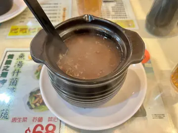 在香港肯定要吃地道的港式中菜和煲仔飯。它家的招牌菜是煲仔飯的,我們點了一個超值的海鮮雙人套餐$348,也包括了一份煲仔飯:1)紅燒雞絲鮑翅:這個湯羹是香港古早的做法,典型的舊香港風味。魚翅有一整塊"荷包翅",入口就是爽,羹內還拌有雞肉絲。2)椒鹽魚片頭:大大塊的魚片頭,輕炸上碟,再撒上椒鹽。入口外脆內軟,啖啖的魚肉,很有滿足感。3)蒜蓉粉絲蒸帶子:帶子又大又新鮮,蒸得嫩,入口爽滑,大廚的手藝真不錯。4)蒸陳皮鮑魚:鮑魚也是蒸得剛剛好,嫩滑爽口。5)合時油萊:是淋上醬油的新鮮生菜。6)北菇滑雞煲仔飯:煲仔飯的火候掌握得恰到好處,焗出的雞肉嫩滑;北菇即香菇,焗出濃厚的菇香味。盛出的白飯,淋上店家調制過的甜醬油,不會太咸,又香又好吃。店家的絕招來了:首創專人起飯焦服務:起出飯焦後,侍應教客人可以撒一些白糖在上面,等5分鐘再吃。吃起來微甜、焦脆可口,侍應說這是舊香港小童的零食,時代的回憶。加分的是:餐廳侍應的服務態度很好,讓客人有的親切感覺。…查看更多
